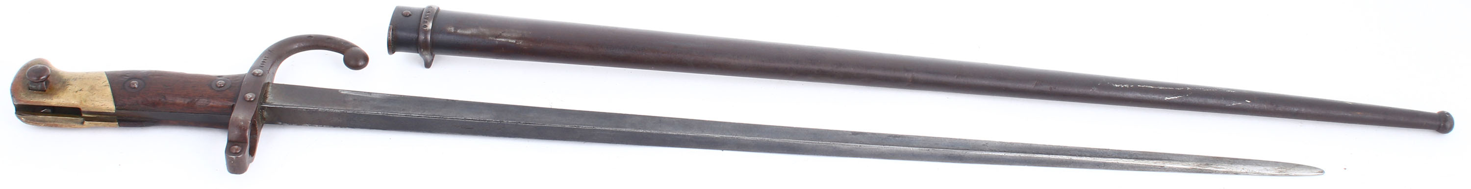 CONDITION: The straight wrist walnut stock is very good, as being sanded & oiled. The metal is proud to the wood around the top of the buttplate, trigger guard tangs, upper receiver tang & the rear sling mount. The left cheek of the stock has a heavily faded S/N marking that appears to match the rifle. The right cheek of the stock has a heavily faded, roundel acceptance cartouche with the boxwood plug in the middle. The boxwood plug is marked ''MA''. The metal retains 60% blue with areas of thinned blue, gun metal gray, brown patina, roughness & rust speckling. There is spots of light pitting/roughness around the stock line. The left side of the receiver is marked with two Belgium proofs, ''MANUFACTURE D.ARMES'', ''ST.ETIENNE'', ''MLE 1874''. The top of the receiver band has one small shield proof. The right rear of the receiver has two more small proofs. The left rear of the barrel is marked with the S/N over a large set of Belgum proofs, ''P.G'', ''M'' in circle, ''J'' in circle. The top rear of the barrel has two worn proofs. The right rear of the barrel is marked ''S.1875'' two small proofs, ''MA'', & a few other proofs. More small proof markings on the upper buttplate tang, trigger guard tangs, rear barrel band, & the bolt. Belgium proof marks on the bolt face, bolt body, & the striker body. Front barrel band marked ''PA''. buttplate marked ''43''. S/N matching bolt (all parts) & bayonet lug. The bore is very good. Its bright with strong rifling & spots of roughness/ light pitting. The barrel holds a barleycorn front sight with a tangent/ladder V-notch rear sight. No markings on rear sight base, the ladder is marked 350 on the bottom notch & 4 to 18 on the first ladder, second ladder is unmarked. The stock carries a steel buttplate that's left in the white. Buttplate has roughness & starting to tone brown. rifle has both sling loops & has its cleaning/clearing rod. Rifle comes with the correct MLE 1874 Gras T-back sword bayonet with sheath. Spine marked with the manufacture St. Etienne, & the MFG date 1875. Bayonet & sheath S/N do not match each other nor the rifle. a beautiful example of a early MFG., un-altered Gras rifle that likely saw use with Belgium in WW1. Antique, No FFL Req - Value: 600 to 1200