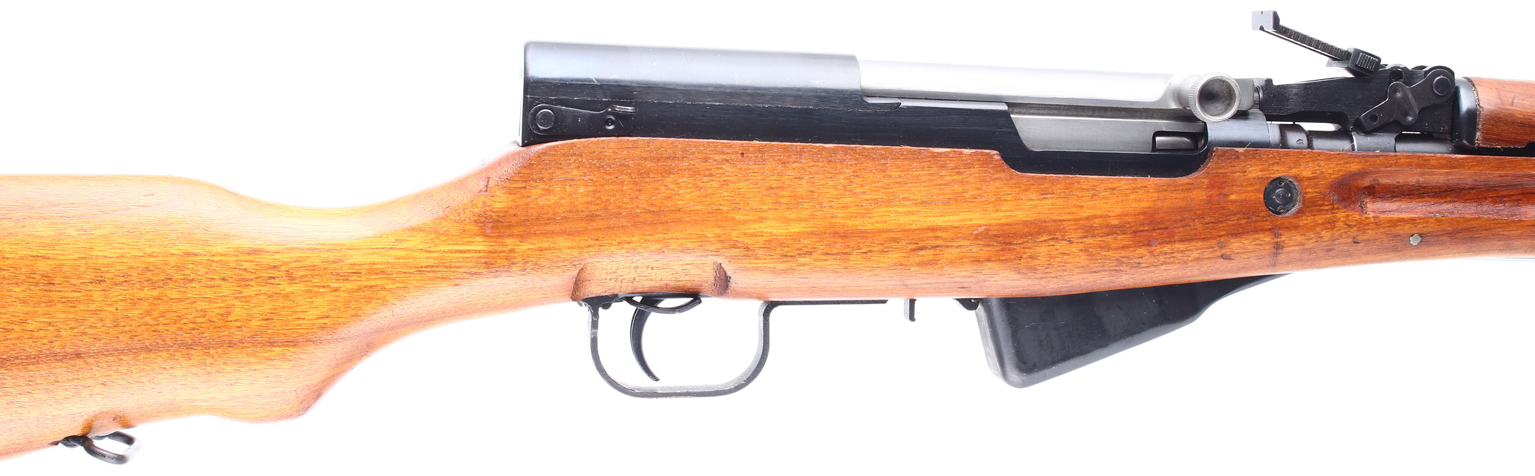 CONDITION: The semi-pistol grip wood stock is excellent with a couple small cosmetic nicks & dings. Left cheek of stock marked ''0570'' & a rectangle with a diagonal line. The blued metal finish on the barrel rates 90% with areas of thinning & spots starting to tone brown. The blued metal finish on the receiver rates 90% with spots of scratches & thinning. Left side of the receiver is marked with the S/N, the factory 0306 triangle logo, & import markings. The rear of the barrel has a couple proof marks. S/N matching magazine, trigger guard, bolt, & bolt carrier. The bore is excellent. Its bright & mirrorlike with little to no visible wear. Chrome lined bore. Post front sight with protective globe, Tangent U-notch rear sight with a battle zero mark & 1 to 10 markings. The blue steel trapdoor buttplate, has a cleaning kit inside. No cleaning rod. Affixed folding cruciform bayonet. Rifle has both sling loops. A beautiful example of a scarce Type 56 SKS manufacturer. FFL or C&R Req. - Value: 400 to 800