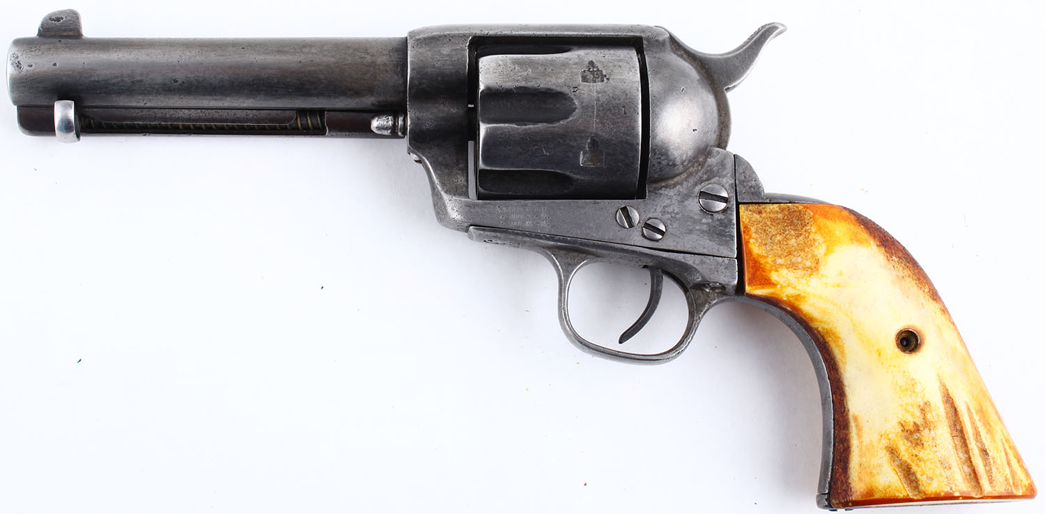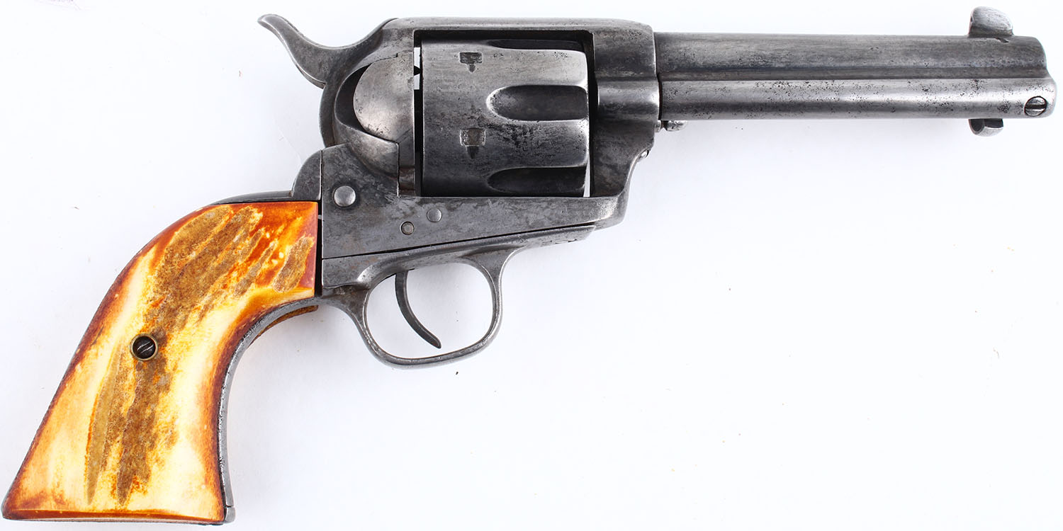 UNIQUE SET, Colt, 1873 Single Action Army, CAL: 44/40, MFG: 1882, SN: 79801, Single Actin Revolver, 4 3/4'' barrel. The barrel markings have been buffed smooth. The three line patent date on the left side of the frame is worn, but legible. All matching SN on the frame, trigger guard & butt. The authentic bone grips are excellent. They appear to have a stain or lacquer. The blued finish on the barrel & trigger guard has fully worn to metal gray & the case-hardened finish on the frame has full worn to metal gray, with shadowing remaining. Bore is fair, with consistent roughness & pitting. Integral v-notch rear sight & blade front sight. This revolver is accompanied by a 1886 A.M Nash Money Belt, marked ''AM NASH SADDLERY TRINIDAD, COLORADO''. The belt holds a 1898 R.T Frazier tooled single loop holster, marked ''R.T. FRAZIER PUEBLO, CO''. Additionally, the belt holds an unmarked knife sheath carrying a an unmarked blade with bone handle & a U.P Railroad Police Badge, marked ''COLORADO BRAND INSPECTOR''. Blade condition is very good, with some discoloration. A unique set, with accoutrements. Antique, No FFL Req. - Value: 2500 to 4500
