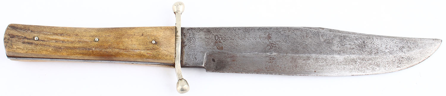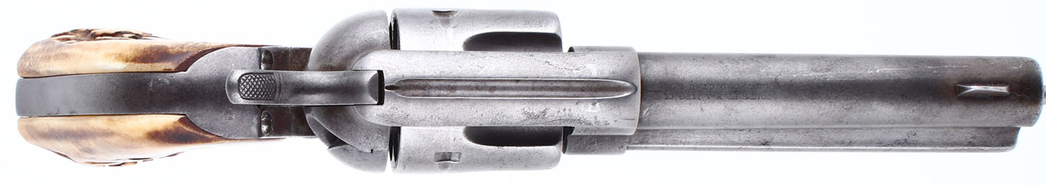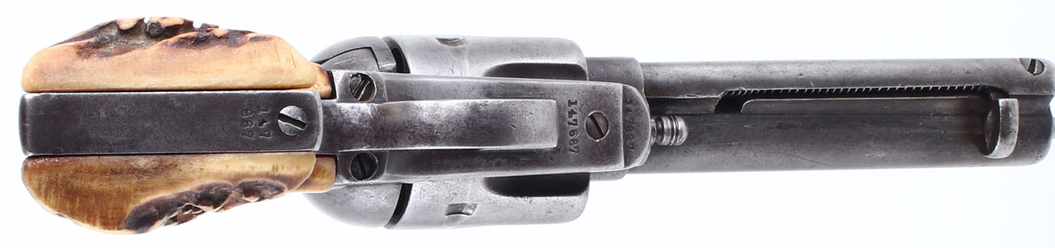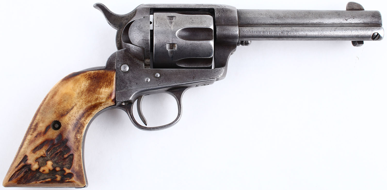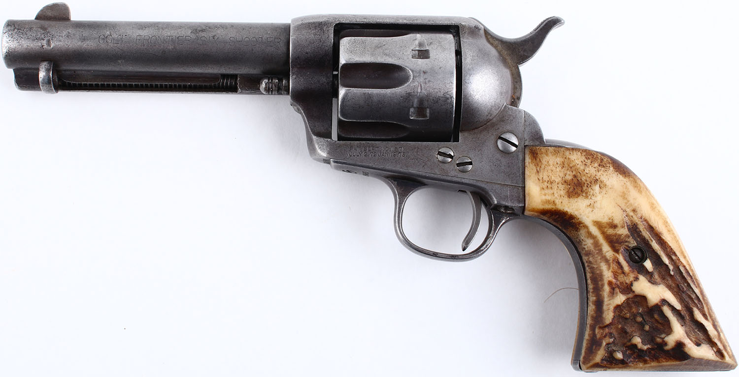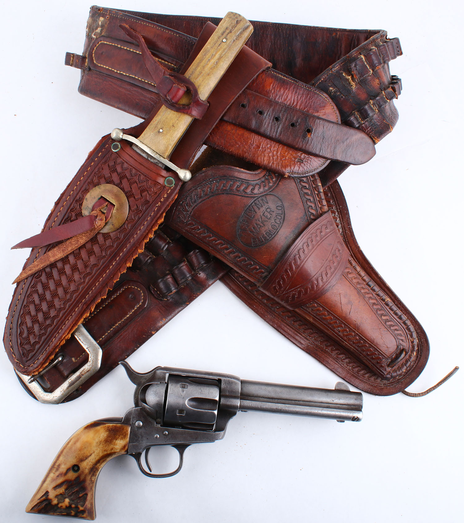 UNIQUE SET, Colt, Frontier Six Shooter, CAL: 44-40, MFG: 1892, SN: 147667, Single Action Revolver, 4 3/4'' barrel. The top of the barrel has the standard two line address stamp. The left side of the barrel is marked ''COLT FRONTIER SIX SHOOTER''. The left side of the frame is marked with the standard patent dates & a circled Rampant Colt logo. All matching SN's on the frame, trigger guard & butt. The authentic Stag grips are excellent. The blued metal finish has fully worn to metal gray, with areas of pitting & chatter marks throughout. Bore is good, consistently rough, with light pitting & thinned rifling. Integral v-notch rear sight & blade front sight. Mechanical operation appears to function properly. This revolver is accompanied by an unmarked leather ammo belt, that holds a late 1800's - early 1900's Tom Flynn tooled holster, marked ''T.FLYNN MAKER PUEBLO COLO'' & a tooled leather knife sheath marked ''K.A COLEMAN MAKER HALSEY, OR''. The knife sheath holds an Original Bowie Knife, with bone handle, marked ''OTHELLO SOLINGEN GERMANY'' on the left side & ''ANTON WINGEN JR SOLINGEN GERMANY'', on the right. Due to their .44-40 W.C.F. chambering, these revolvers could be easily paired with a Winchester Model 1873, allowing their user to be capable at most ranges and in any situation, while only carrying one type of ammunition. Antique, No FFL Req. - Value: 2500 to 4500