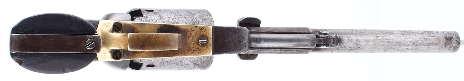 CONDITION: The wood grips are very good, solid with a few shallow dings and scratches as well as an edge chip on the bottom corner of the left side. The gun metal grey is partially covered with a layer of brown patina of varying thickness. The gun has speckled clean pitting throughout. Bore is good, the rifling is strong but slightly darkened with some clean pitting throughout. Mechanically solid, seems to function well. The barrel holds a brass blade front sight, a U-notch rear sight is cut into the hammer.