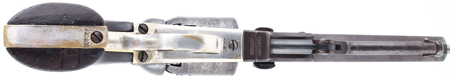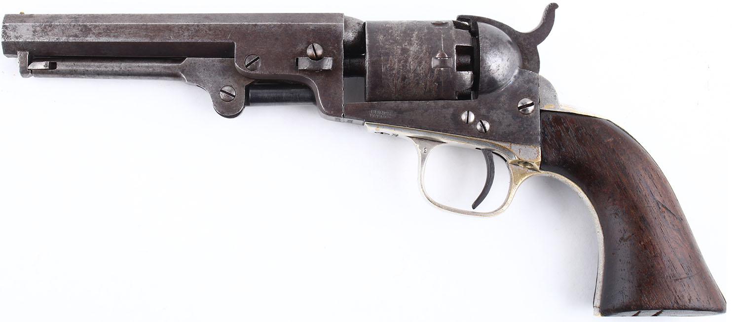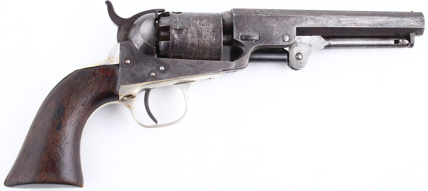 Colt, 1849 Pocket, CAL: 31 Black Powder, MFG: 1862, SN: 220806, Single Action Revolver. 5 barrel. The wood grips are in good condition, solid with some dings and scratches, most notably two gashes on the bottom of the left grip panel. The finish on the barrel has worn and toned to a thin brown patina with some splotches of gun metal grey. The frame has some shadows of case-hardening. The nickel finish on the brass grip frame rates 88%. The top barrel flat is marked ''ADDRESS CCL SAM L COLT NEW YORK CITY US AMERICA'', the left side of the frame is marked ''COLTS PATENT''. Has matching serial numbers on the: grip frame, frame, barrel, cylinder, and barrel wedge. The cylinder has worn markings that are visible but not very defined. Bore is fair, very dark with fairly even roughness and a couple splotches of pitting but defined lands and groves. Mechanically solid with some side to side and back and forth play in the cylinder, hammer and trigger mechanism seems solid. The rear sight notch is cut into the hammer, front bead sight on the barrel near the muzzle. Antique, No FFL Req. - Value: 600 to 1200