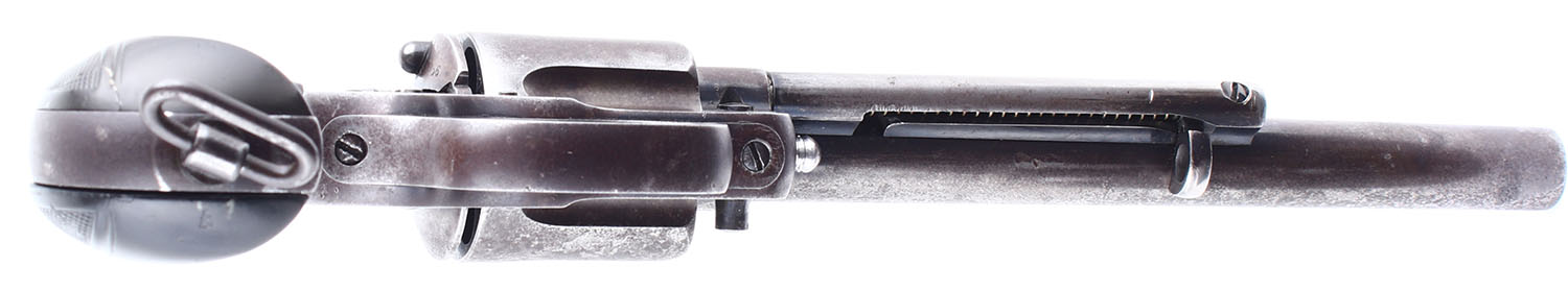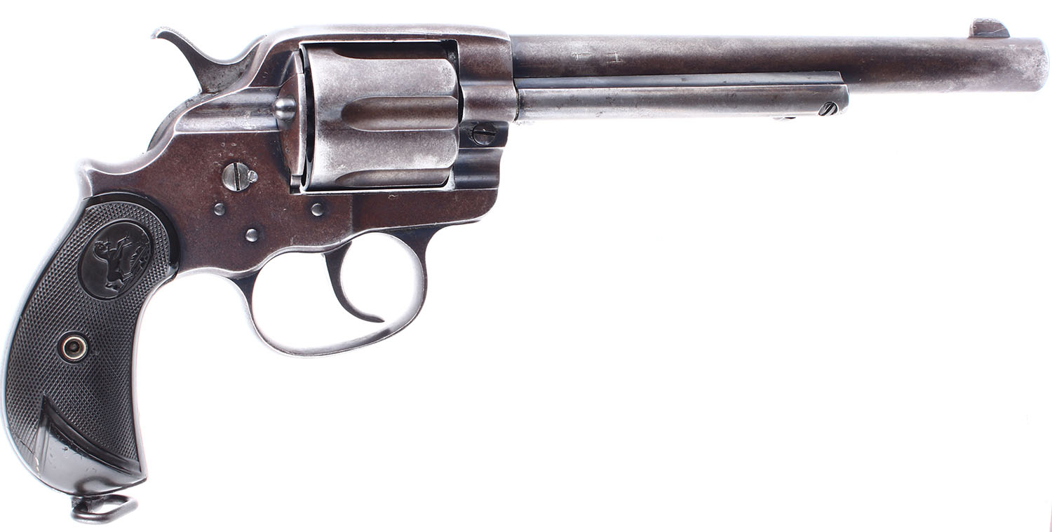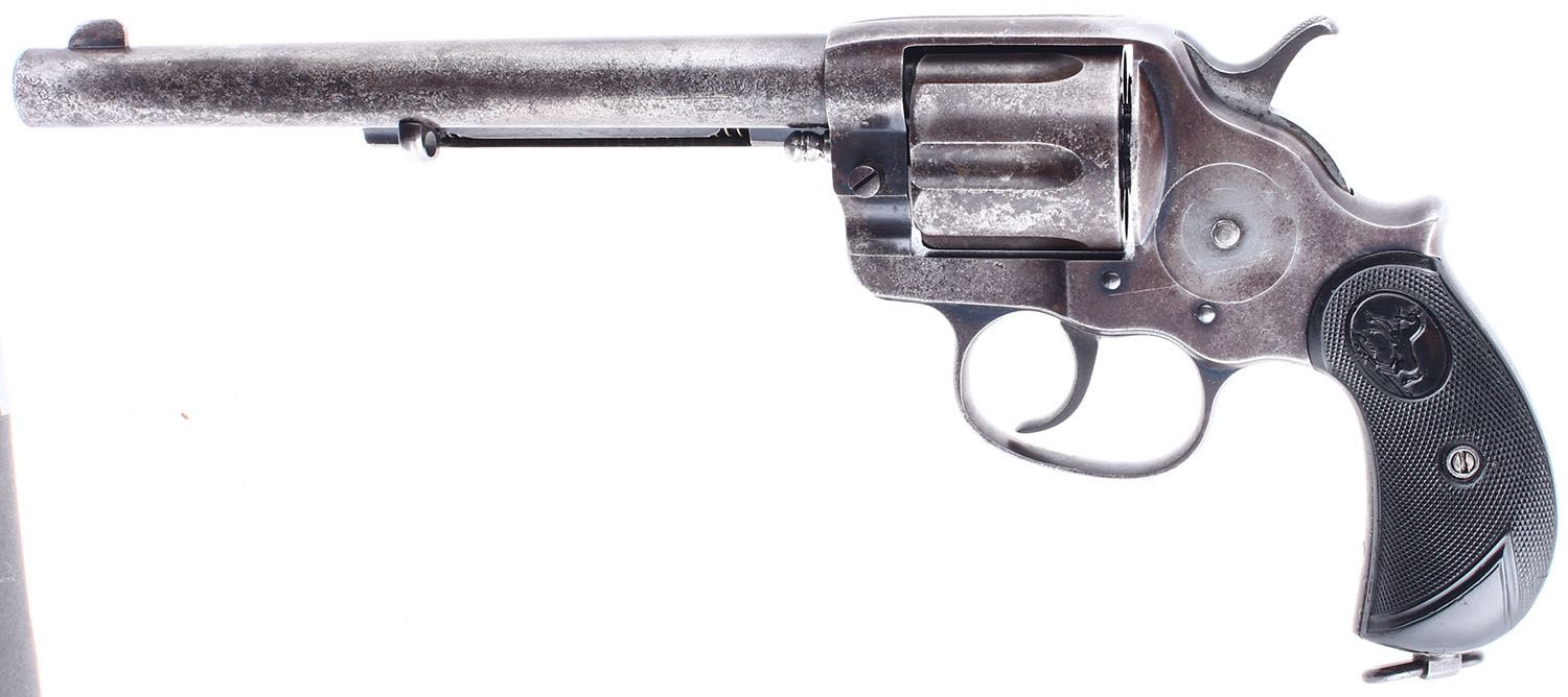 Colt, 1878, CAL: 38-40, MFG: 1898, SN: 38471, Double Action Revolver. 7 1/2'' barrel. Checkered synthetic grips are in good condition with very little handling wear but a large crack on the bottom of the right grip panel. The original bluing has worn and toned to a thin brown patina with some gun metal grey and splotches original bluing on low wear areas, most notably the top and bottom of the ejector housing and the inside of the frame beneath the cylinder. Markings on the top of the barrel read Colts PT. F. A. MFG Co Hartford CT. U.S.A.. Bore is good, rifling has darkened with even roughness and some pitting. Mechanically solid with very little play in the cylinder after the trigger has been depressed. Front blade sight integral to the barrel, rear sight trough is cut into the top of the frame. Antique, no FFL Req. - Value: 700 to 1400