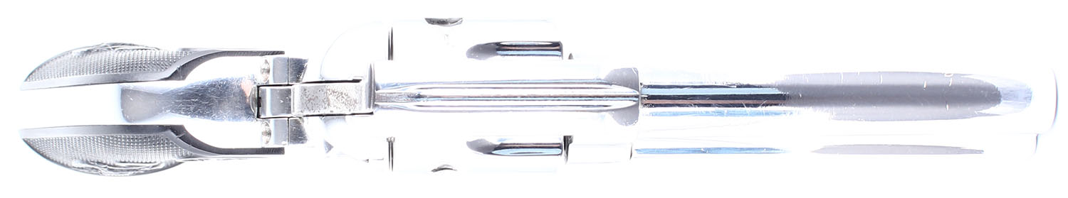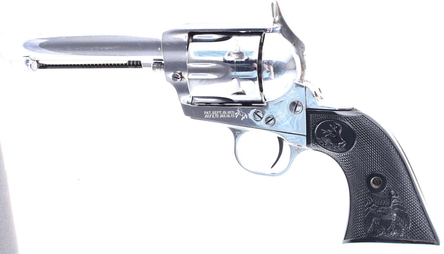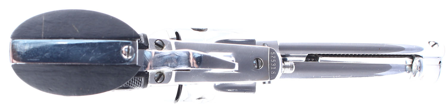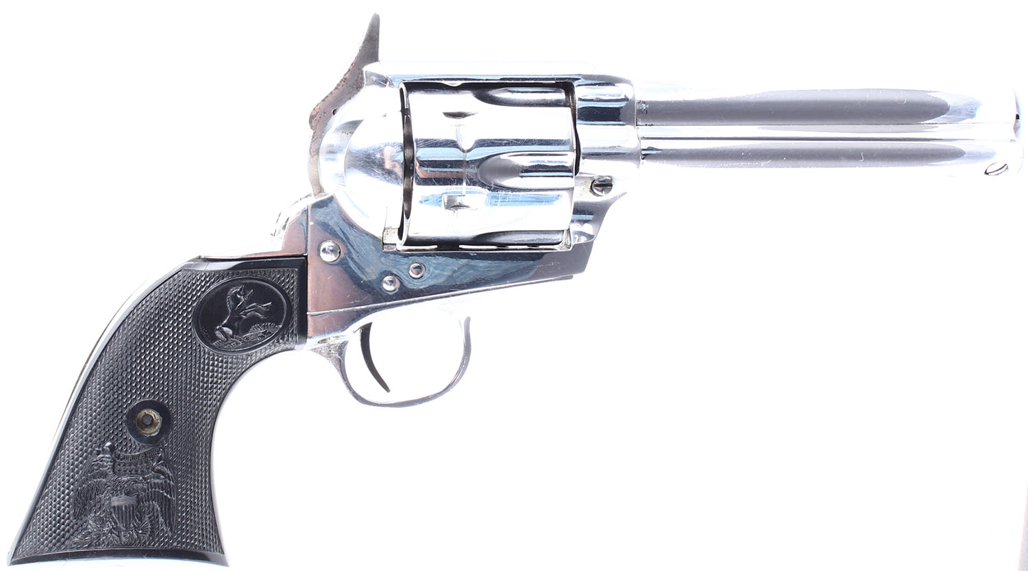 Colt, Single Action Army 2nd Gen, CAL: 45 Colt, MFG: 1969, SN: 52531SA, Single Action Revolver. 4 3/4'' barrel. The checkered plastic grips are in very good condition, solid with light handling wear. The re-nickeled finish is very good with a clear scratch pattern from sanding, the finish on the inside of the frame is uneven and eroded, this can be seen when you remove the cylinder or cock the hammer. There is some rust speckling, most notably on the hammer. There is some light handling wear, including a few dings on the top of the barrel. Bore is fair, very dark with consistent pitting. Mechanically very solid, the cylinder has very little side to side and back and forth play. This revolver was modified to be a Gunslinger/Race gun. These modifications include: enlarged cylinder notches, a cut down barrel, and a modified hammer for fan firing. The trigger mechanism seems to have been smoothed out, either by use or modification. No front sight, rear sight trough is cut into the top of the frame. FFL or C&R Req. - Value: 1000 to 3000
