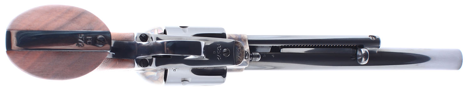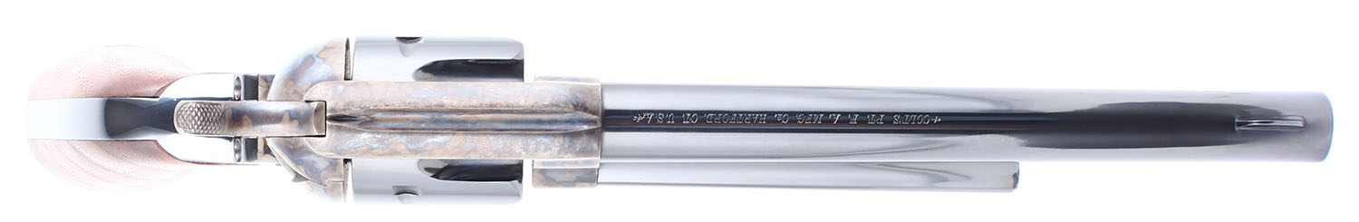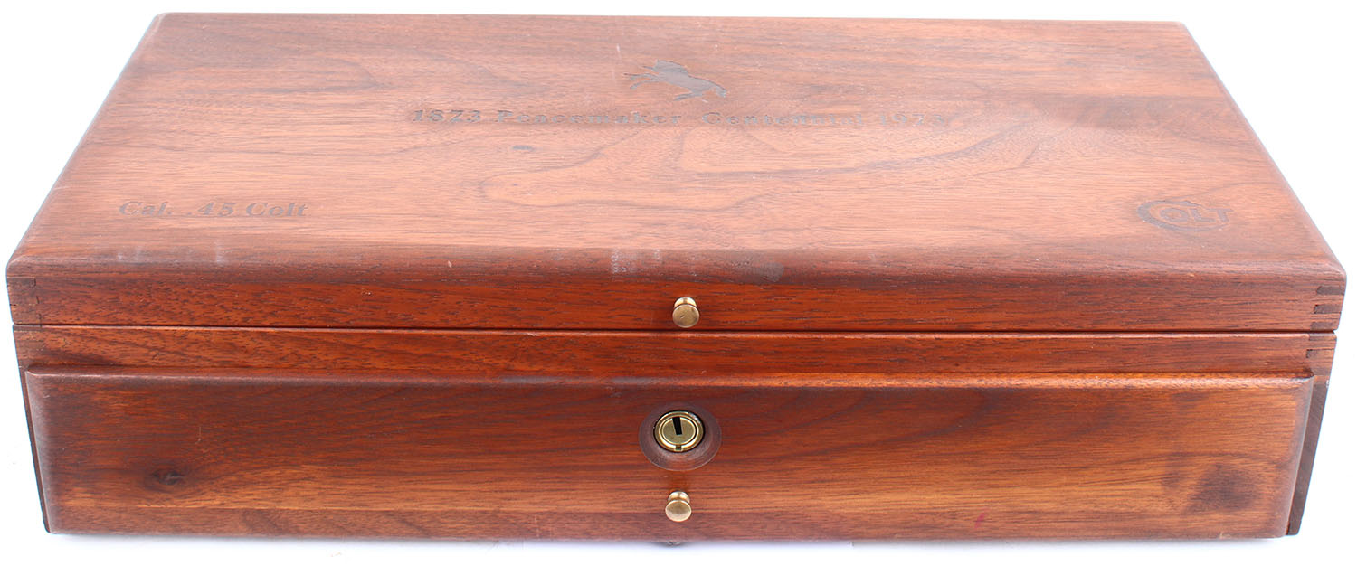 CASED Colt, 1873 Peacemaker Centennial, CAL: 45 Colt, MFG: 1973, SN: PC572, Single Action Revolver. 7 1/2'' barrel. The wood grips have SLC (Samuel L. Colt) engraved on the bottom of the left hand panel and are in excellent condition. The blued finish on the barrel, cylinder, grip frame, and trigger rates 99%. The case hardened frame and hammer are in excellent condition. The side of the barrel is marked 1873 PEACEMAKER CENTENNIAL 1973. Bore is excellent. Mechanically very solid, the cylinder has very little side to side and back and forth play. Front blade sight is integral to the barrel, rear sight trough is cut into the top of the frame. Comes in a purple felt lined wooden display case with commemorative metal placard. FFL or C&R Req. - Value: 1500 to 3000