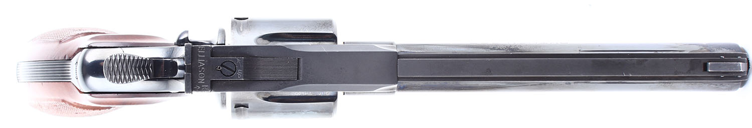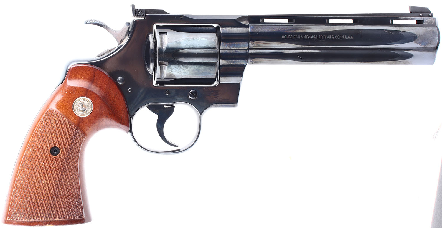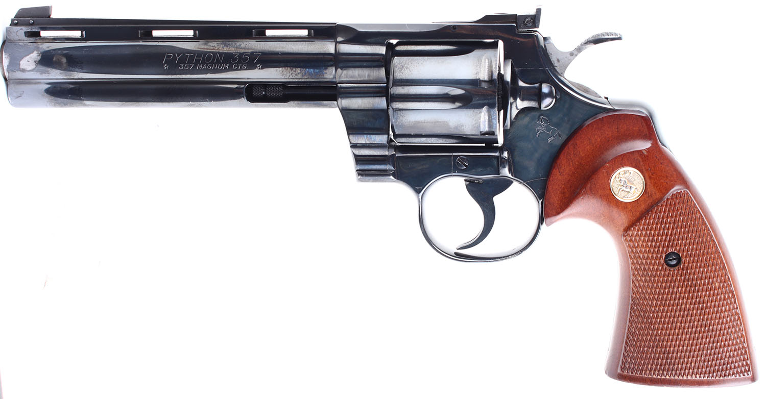 Colt, Python, CAL: 357 MAG, MFG: 1978. SN: 91288E, Double Action Revolver, 6'' barrel. The checkered wood grips with Colt medallions are in excellent condition with some handling wear and very minor chips. The bluing on the gun rates 98% with some wear, most notably two splotches of exposed gun metal grey on the right side of the barrel near the muzzle. Bore is excellent. Mechanically solid, seems to function well. The cylinder has some play but locks up tight when the trigger is fully depressed. Blacked out target sights, serrated front ramp sight is pinned to the barrel, windage and elevation adjustable rear sight is pinned to the top of the frame. Comes in a generic black plastic case. FFL or C&R Req. - Value: 1500 to 3000