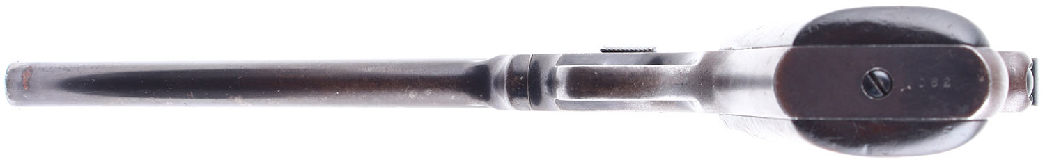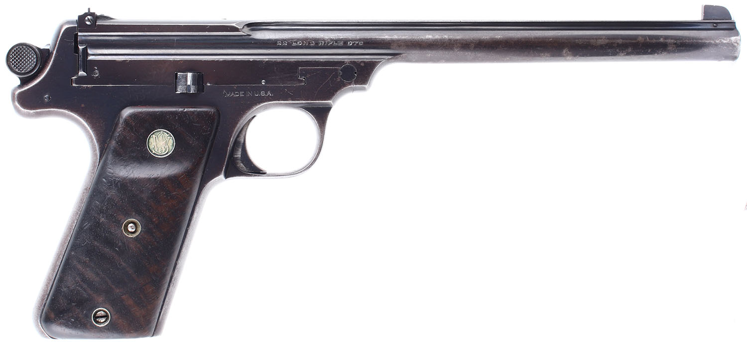 CASED Smith & Wesson, Straight Line Target, CAL: 22LR, MFG: 1925-36 SN: 390, Single Shot. 10'' barrel. The wood grips are in very good condition with light handling wear, there seems to be a thick matte finish on them that has darkened substantially. The blued finish rates 50% with substantial handling wear and patina. Bore is excellent. Mechanically solid. Rudimentary sights, front blade sight is pinned to the barrel, rear sight is set in a cut on the barrel. Comes in a green fabric lined metal case with a cleaning rod and a screwdriver. FFL or C&R Req. - Value: 800 to 1600