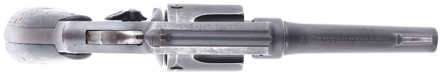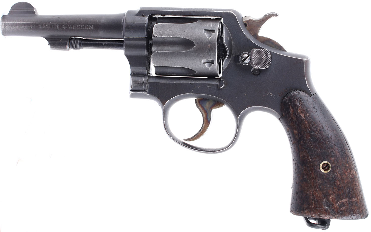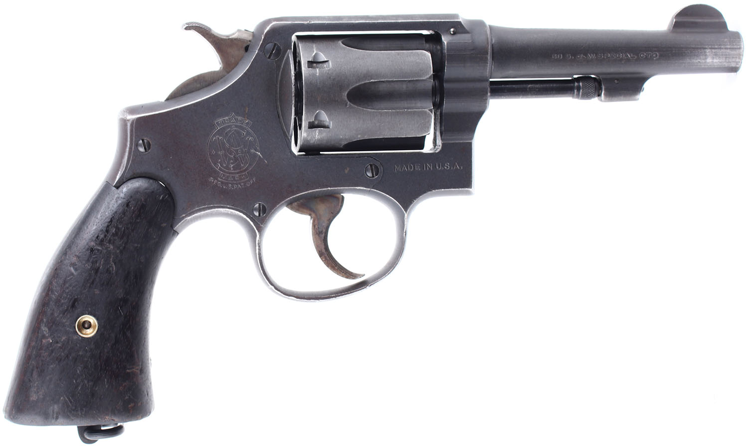 Smith & Wesson, Victory Model, CAL: 38 SPL MFG: 1942-45. SN: V289974, Double Action Revolver. 4'' barrel. The wood grips are very good with some handling wear & contusions. The parkerized finish is very good with almost full coverage, there is some wear and patina mostly concentrated high wear areas like the front and back strap of the grip. The top of the frame is marked with a US ordnance flaming bomb stamp and U.S. PROPERTY G.H.D.. The face of the cylinder is marked with an S and a V. Bore is excellent, slightly thinned but very bright rifling with little to no roughness. Mechanically solid, the cylinder has little side to side & back & forth play, the hammer & trigger mechanism functions well. Rudimentary sights, front blade sight is integral to the barrel, rear sight trough is cut into the frame. FFL or C&R Req. - Value: 300 to 900