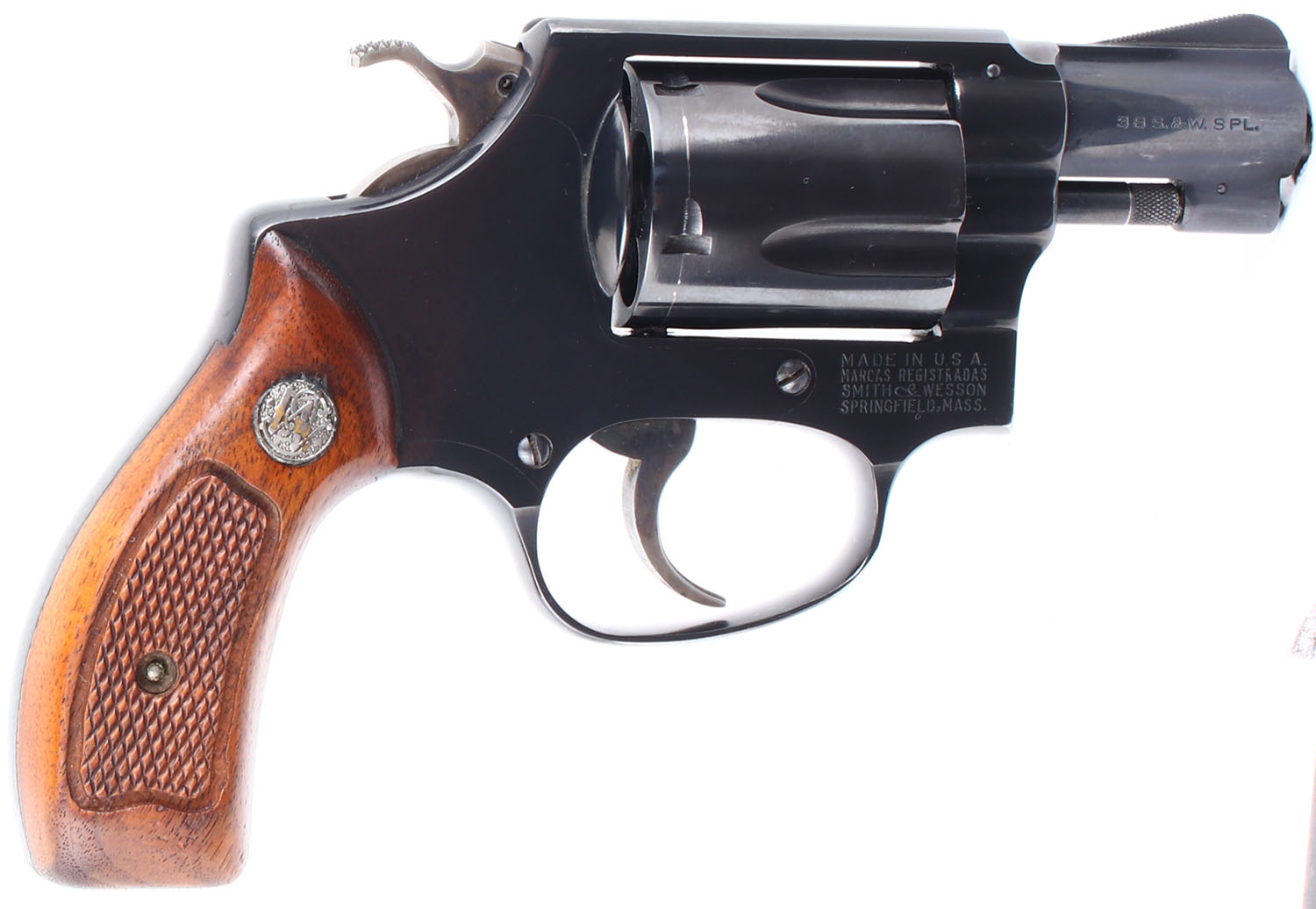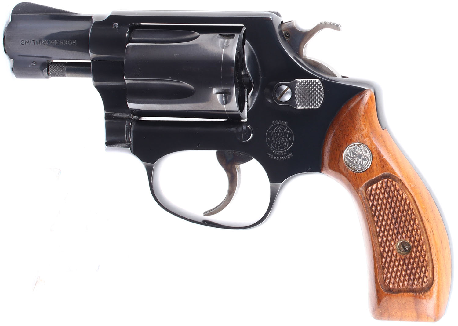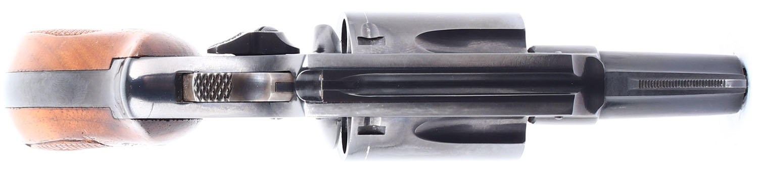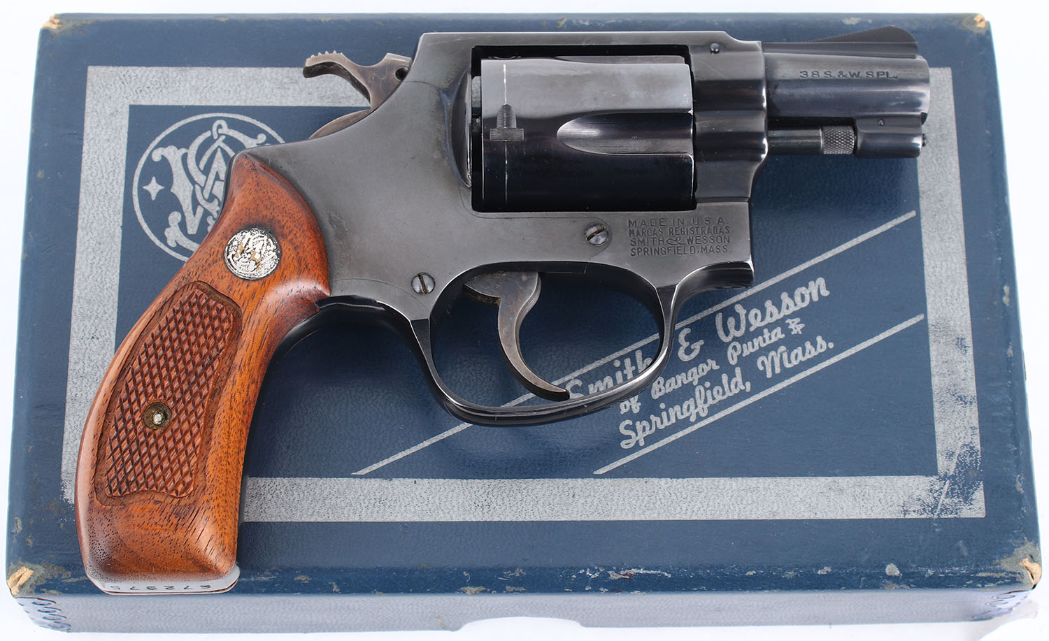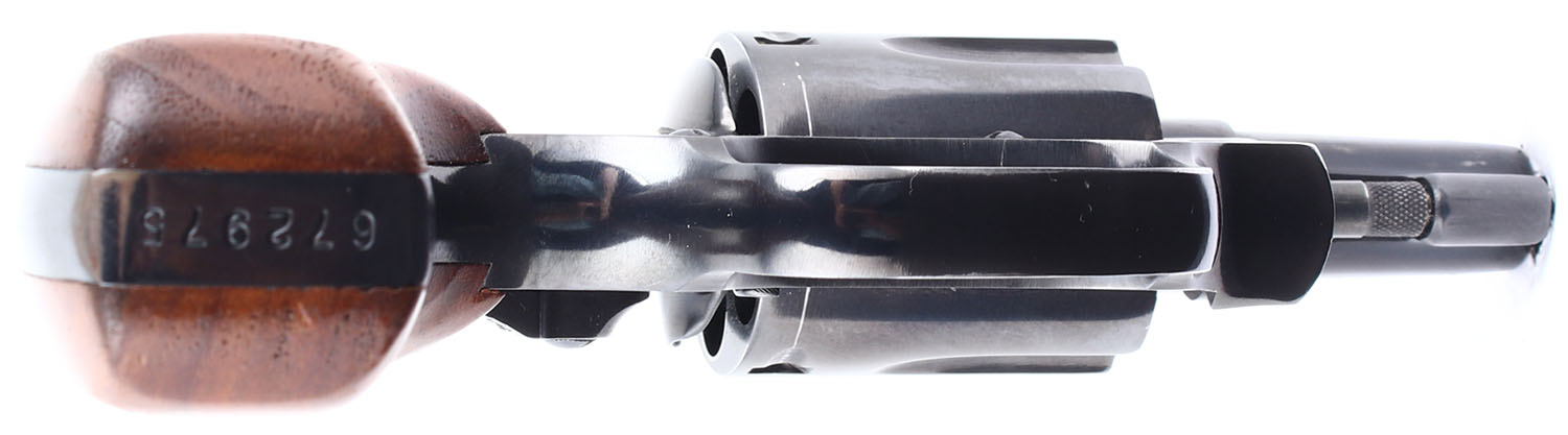 BOXED Smith & Wesson, Model 36, CAL: 38 SPL. MFG: 1962-69. SN: 672975, Double Action Revolver. 1 3/4'' barrel. The checkered wood grips with S&W medallion are excellent. The factory blued finish rates 99% with very light handling wear. The case hardening on the trigger and hammer is excellent. Bore is excellent. Mechanically excellent, the cylinder has hardly any side to side & back & forth play, the hammer & trigger mechanism functions very well, and the cylinder lock up when the hammer is cocked is incredibly tight. Rudimentary sights, serrated front ramp sight is integral to the barrel, rear sight trough is cut into the frame. Comes in the factory box with an owners manual and other related paperwork. FFL or C&R Req. - Value: 400 to 800