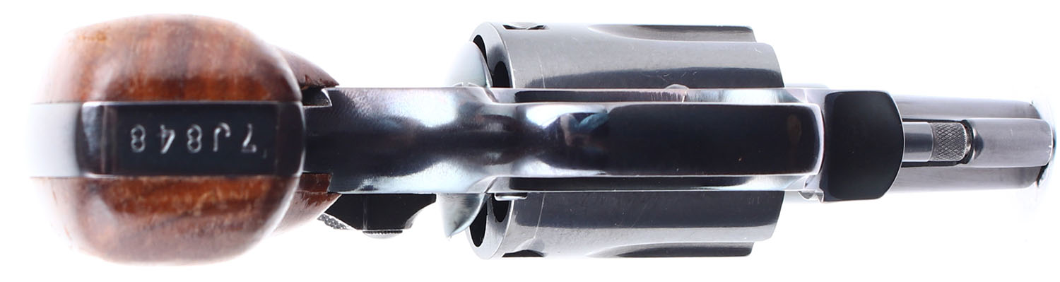 Smith & Wesson, Model 36, CAL: 38 SPL. MFG: Modern. SN: 7J848, Double Action Revolver. 1 7/8'' barrel. The checkered wood grips with S&W medallion are in good condition with some handling wear and dings, the right grip panel is chipped near the top where it meets the frame. Part of the grips have been stained black by the retention strap of the leather holster. The factory blued finish rates 99% with very light handling wear. The case hardening on the trigger and hammer is excellent. Bore is excellent. Mechanically solid, the cylinder has very little side to side & back & forth play, the hammer & trigger mechanism functions very well. Rudimentary sights, serrated front ramp sight is integral to the barrel, rear sight trough is cut into the frame. Comes in a generic black leather holster. FFL Req. - Value: 400 to 800