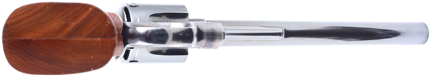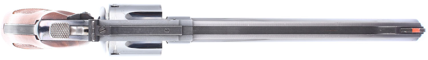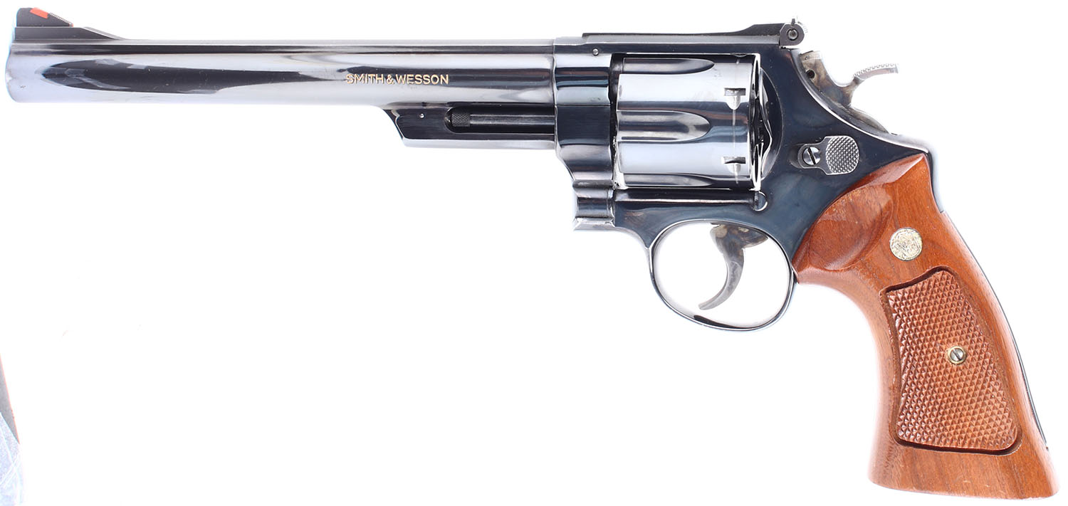 Smith & Wesson, 25-2, CAL: 45 Colt. MFG: 1980-83. SN: N822411, Double Action Revolver. 8 1/4'' barrel. The factory checkered wood grips are in excellent condition with light handling wear. The factory bluing rates 97% with light handling wear. The case hardening on the hammer and trigger is excellent. Bore is excellent. Mechanically solid, the cylinder has some side to side & back & forth play. Contrast revolver sights, serrated front ramp sight with a red plastic insert set in a dovetail cut is integral to the barrel, windage and elevation adjustable rear sight with white U notch is screwed to the top of the frame. FFL Req. - Value: 1000 to 2000