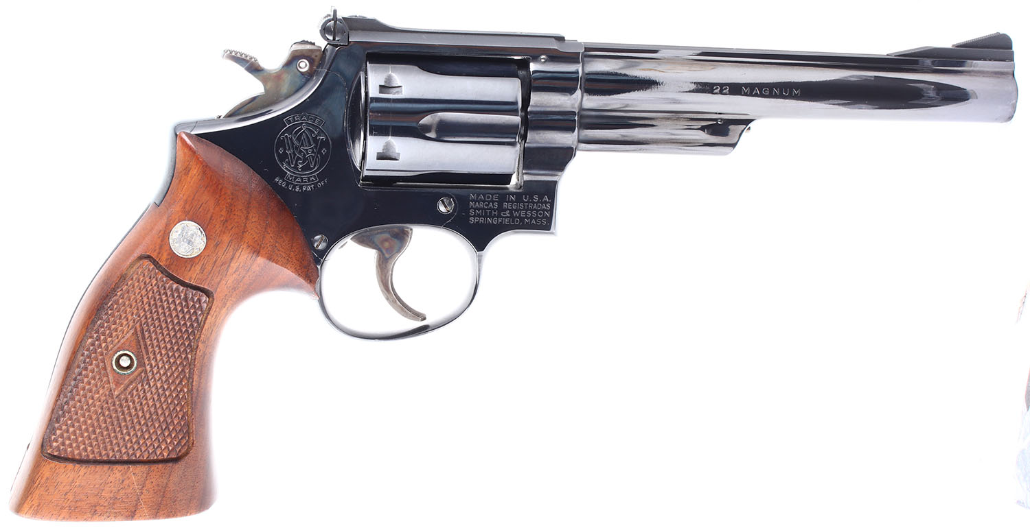 BOXED Smith & Wesson, Model 53, CAL: 22 JET/22LR. MFG: 1961. SN: K462168, Double Action Revolver. 5 7/8 barrel. The factory checkered wood grips with S&W medallions are in excellent condition with very light handling wear. The factory blued finish rates 98% with very light handling wear and a small ding on the right side of the barrel. Bore is excellent. Mechanically solid, the cylinder has very little side to side & back & forth play. Blacked out target sights, serrated front ramp sight is integral to the barrel, windage and elevation adjustable rear sight is screwed to the top of the frame. Comes in a Smith and Wesson model 53 cardboard box (Not serially matching) with a full set of 22 LR sleeves for the 22 JET cylinder and a dedicated 22 LR cylinder. FFL or C&R Req. - Value: 1000 to 2000