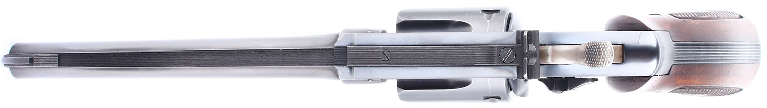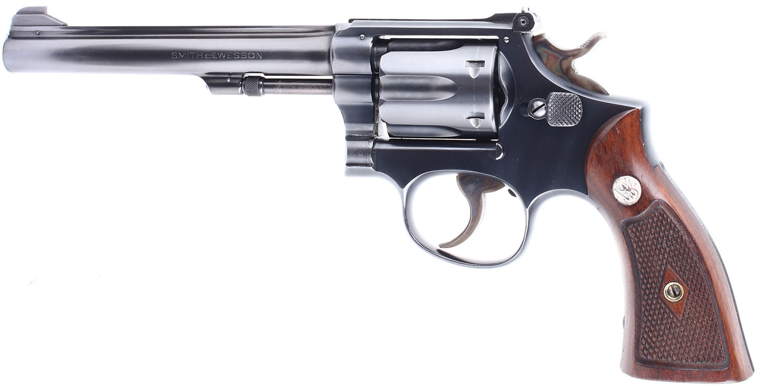 CONDITION: The factory checkered wood grips with S&W medallions are in excellent condition. The factory blued finish rates 99% with very light wear. The case hardening on the hammer and trigger is excellent with the trigger being slightly faded but the hammer being vibrant and crisp. Bore is excellent. Mechanically very solid, the cylinder has very little side to side & back & forth play. Blacked out target sights, serrated front ramp sight is integral to the barrel, windage and elevation adjustable rear sight is screwed to the top of the frame.