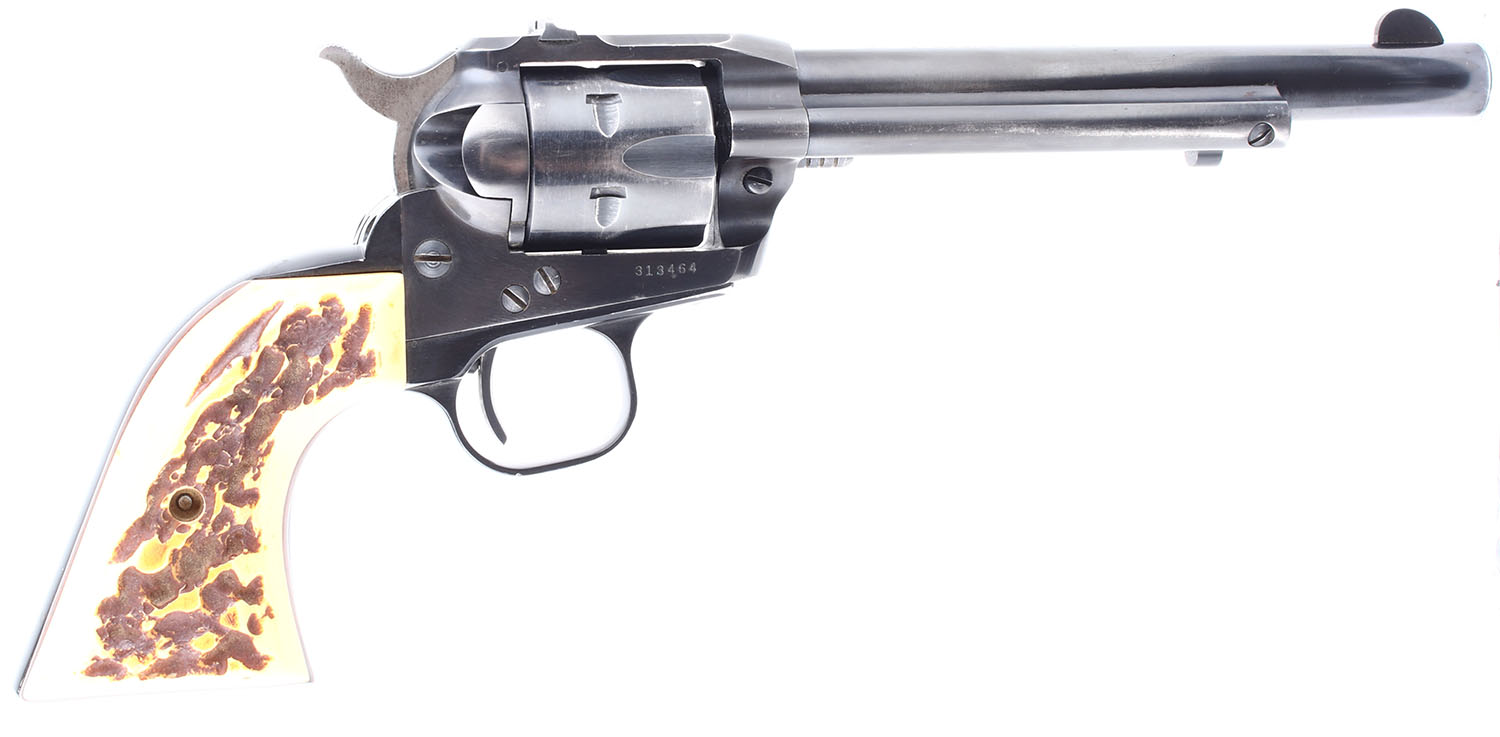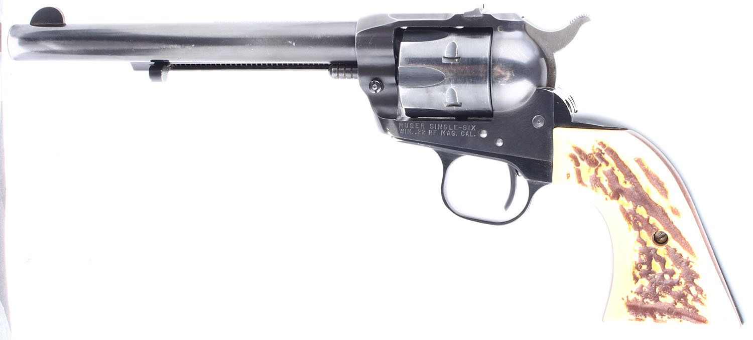 Ruger, Single Six, CAL: 22 WMR. MFG: 1960. SN: 313464, Single Action Revolver. 6 1/2 barrel. The faux stag grips are in excellent condition with some handling wear. The bluing rates 91% with light handling wear and some holster wear. The blue has fully worn to gun metal gray around some of the corners of the frame. Bore is excellent. Mechanically solid, the cylinder has some side to side & back & forth play. Blacked out target sights, the rear sight is set in a dovetail cut on the frame, the serrated front sight is integral to the barrel. FFL or C&R Req. - Value: 250 to 500