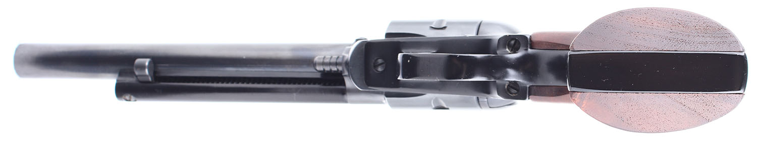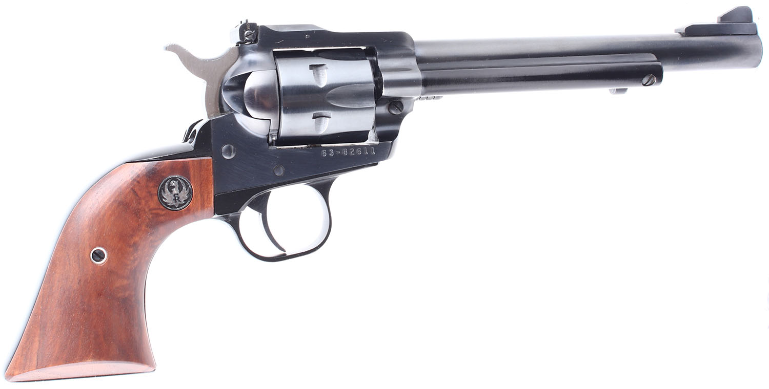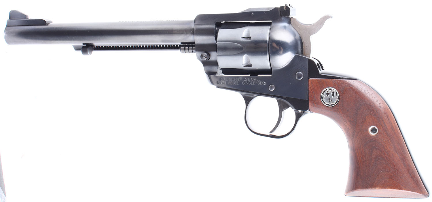 BOXED Ruger, New Model Single Six, CAL: 22 LR. MFG: 1975. SN: 63-82611, Single Action Revolver. 6 1/2 barrel. The factory wood grips with Ruger medallions are in excellent condition. The bluing rates 99%. Bore is excellent. Mechanically good, the cylinder has very little side to side & back & forth play. The hammer and trigger mechanism is slightly stiff and will occasionally get stuck in the forward position, after cycling it a few times with a bit of oil in the mechanism it loosened up substantially. The mechanical function will likely improve drastically if the gun is cleaned thoroughly. Blacked out target sights, the rear windage and elevation adjustable sight is pinned in a cut on the frame, the serrated front sight is screwed to the barrel. Comes in a factory Ruger cardboard box with an owners manual. FFL or C&R Req. - Value: 400 to 800