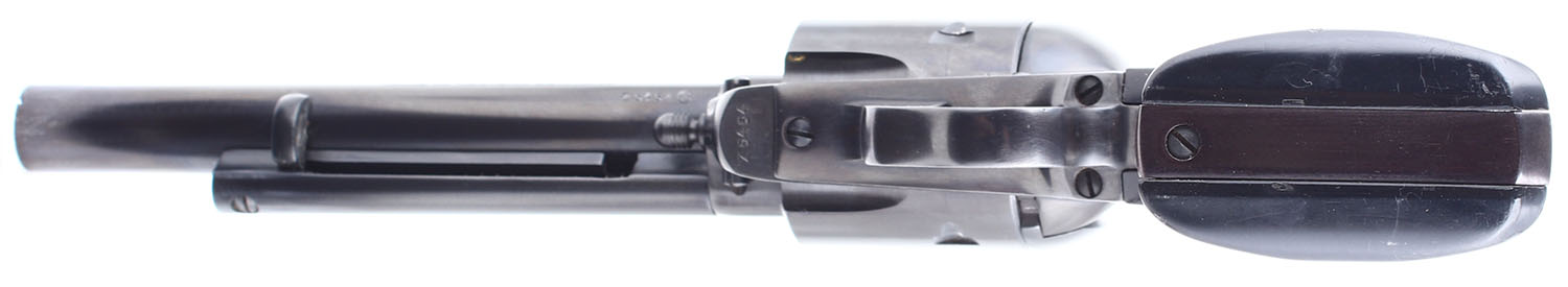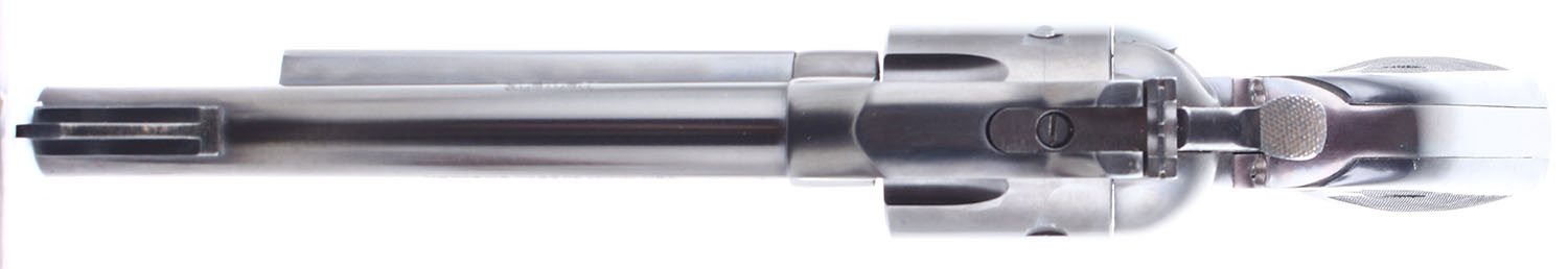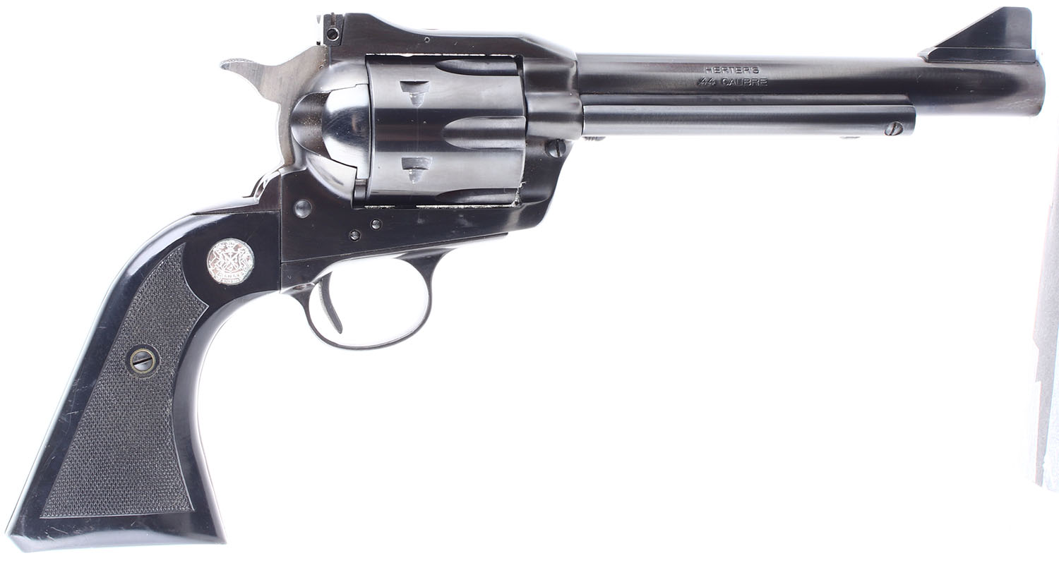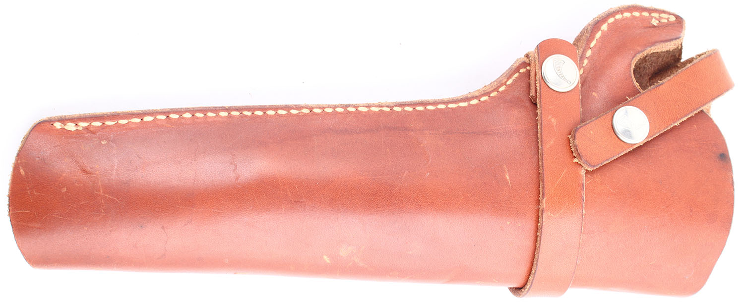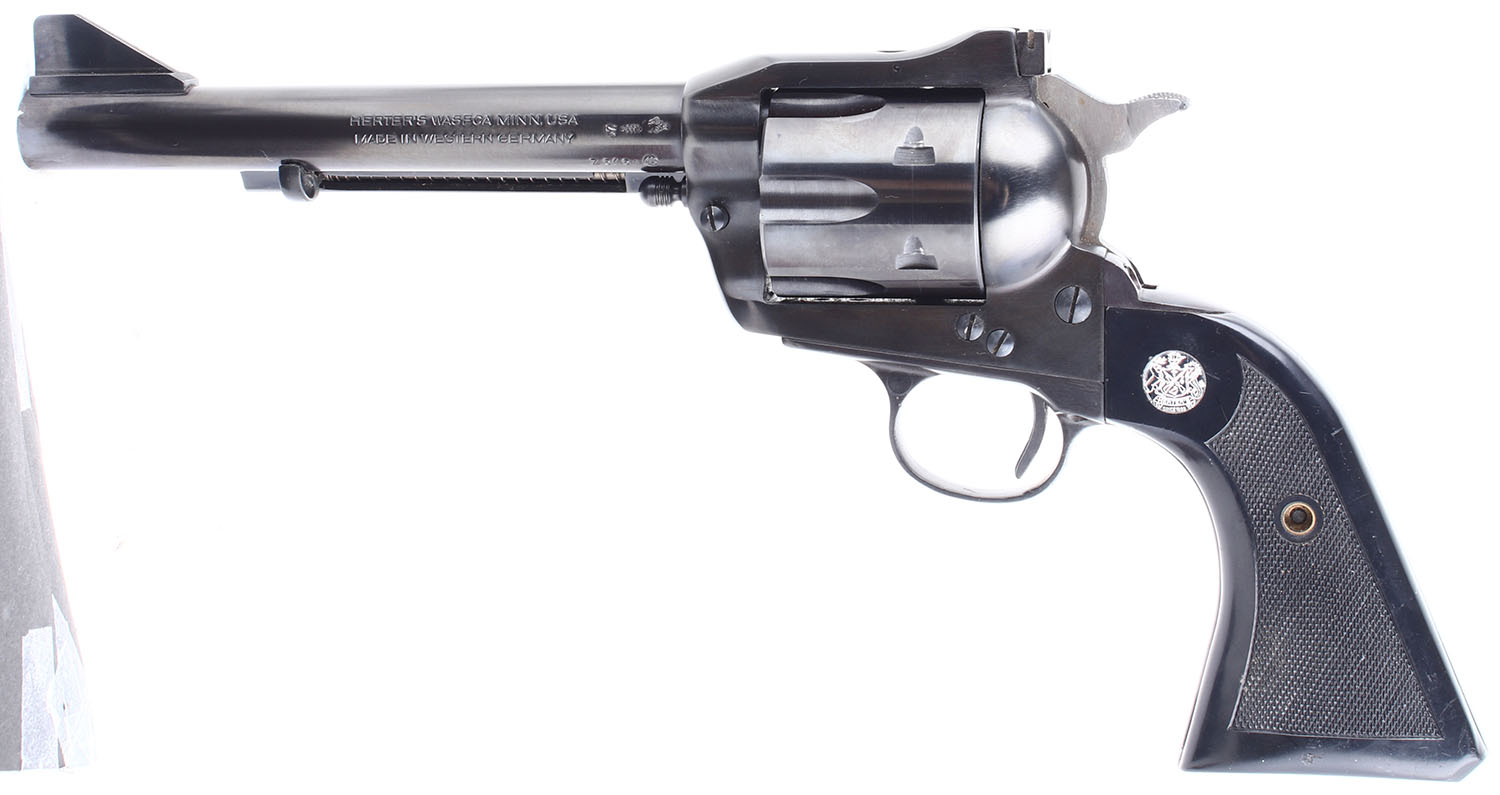 Herters (Germany, Imported by Waseca), Power Mag (Ruger Blackhawk clone), CAL: 44 MAG. MFG: 1967. SN: Z5454, Single Action Revolver. 6 1/2 barrel. The checkered plastic grips with medallions are very good with some handling wear. The bluing on the gun rates 98% with light wear. Bore is excellent. Mechanically solid, the cylinder is very solid with tight lock up. Blacked out target sights, serrated front ramp sight is integral to the barrel, windage and elevation adjustable rear sight is pinned into a cut on the top of the frame. Comes in a Hunter brand leather holster marked 1100K 50. FFL or C&R Req. - Value: 250 to 500