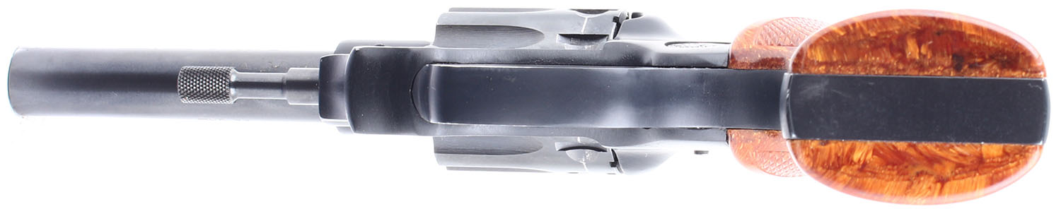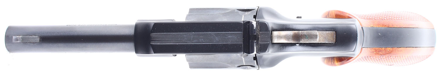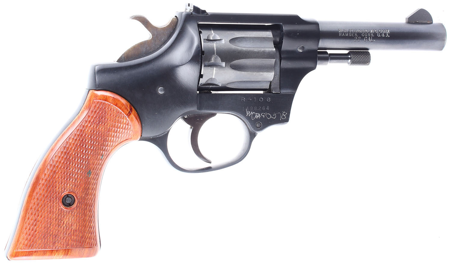 High Standard, Sentinel Deluxe, CAL: 22 LR. MFG: 1964. SN: 1498264, Double Action Revolver, 4'' barrel. The checkered plastic grips are in excellent condition with very light handling wear. The bluing on the gun rates 98% with light wear. The case hardening on the hammer is excellent. Bore is excellent. Mechanically solid, the cylinder has some side to side & back & forth play, the cylinder lock up when the trigger is fully depressed is incredibly tight. Blacked out sights, the rear sight is set in a dovetail cut on the frame, the front sight is integral to the barrel. FFL or C&R Req. - Value: 200 to 400