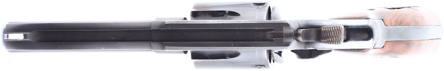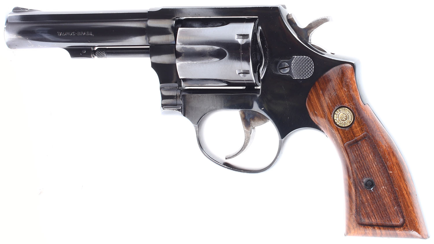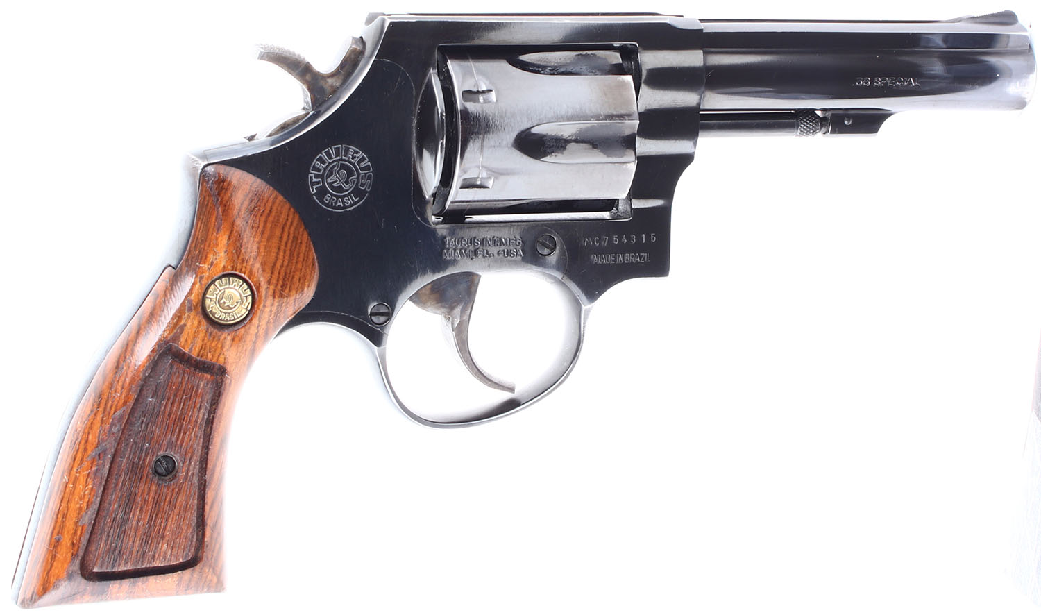 Taurus, M82, CAL: 38 SPL. MFG: 1982-Modern. SN: MC754315, Double Action Revolver, 4'' barrel. The checkered wood grips with taurus medallions are in very good condition with some handling wear and dings. The right grip has a couple of gashes surrounding the checkering and a couple of small dings on the bottom and sides. The bluing on the gun rates 97% with light wear, there is light holster wear on the end of the barrel and light handling wear on the backstrap of the grip frame. The case hardening on the hammer and trigger is very good but slightly faded. Bore is very good, slightly thinned but very bright with little to no roughness. Mechanically solid, the cylinder has some side to side & back & forth play. Rudimentary sights, serrated front ramp sight with white paint is integral to the barrel, rear trough sight is cut into the frame. Comes in a generic black plastic case with a set of rubber finger grooved grips that fit well and are in good condition. FFL Req. - Value: 150 to 300