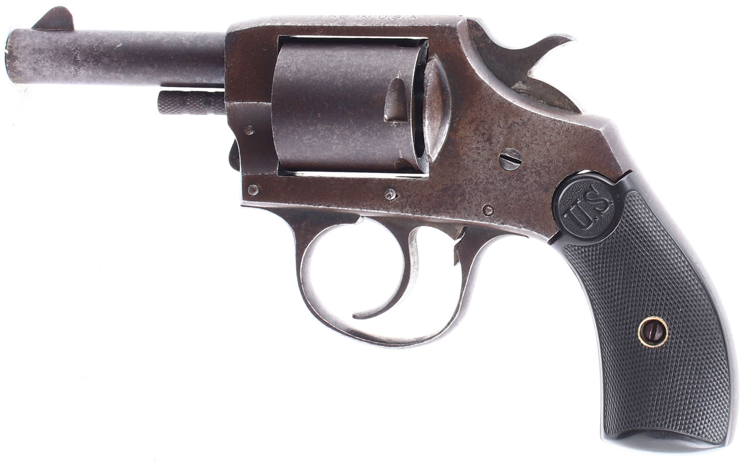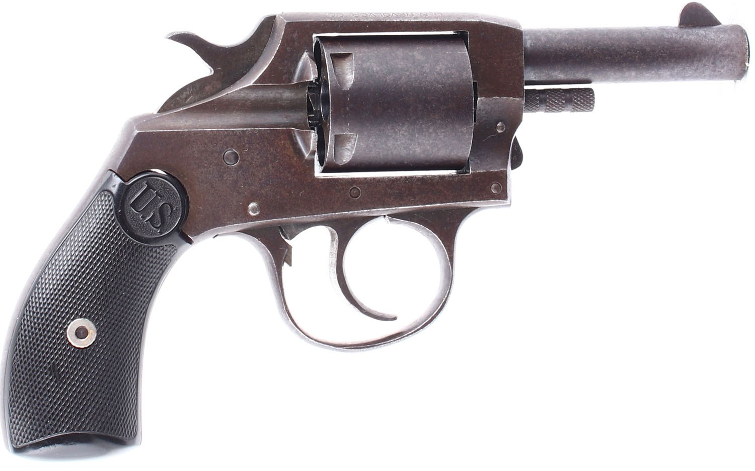 US Revolver CO. CAL: 32 (Possibly S&W Long) MFG: 1910-34. SN: 50605, Double Action Revolver, 2 3/8'' barrel. The checkered hard rubber grips are in excellent condition with light handling wear. The finish on the gun has toned to an even brown patina with some pitting and rust speckling. Bore is good, the rifling is slightly darkened with even roughness. Mechanically solid, the cylinder lock up is relatively tight when the hammer or trigger is engaged. Rudimentary sights, front blade sight is integral to the barrel, rear trough sight is cut into the frame. FFL or C&R Req. - Value: 50 to 100