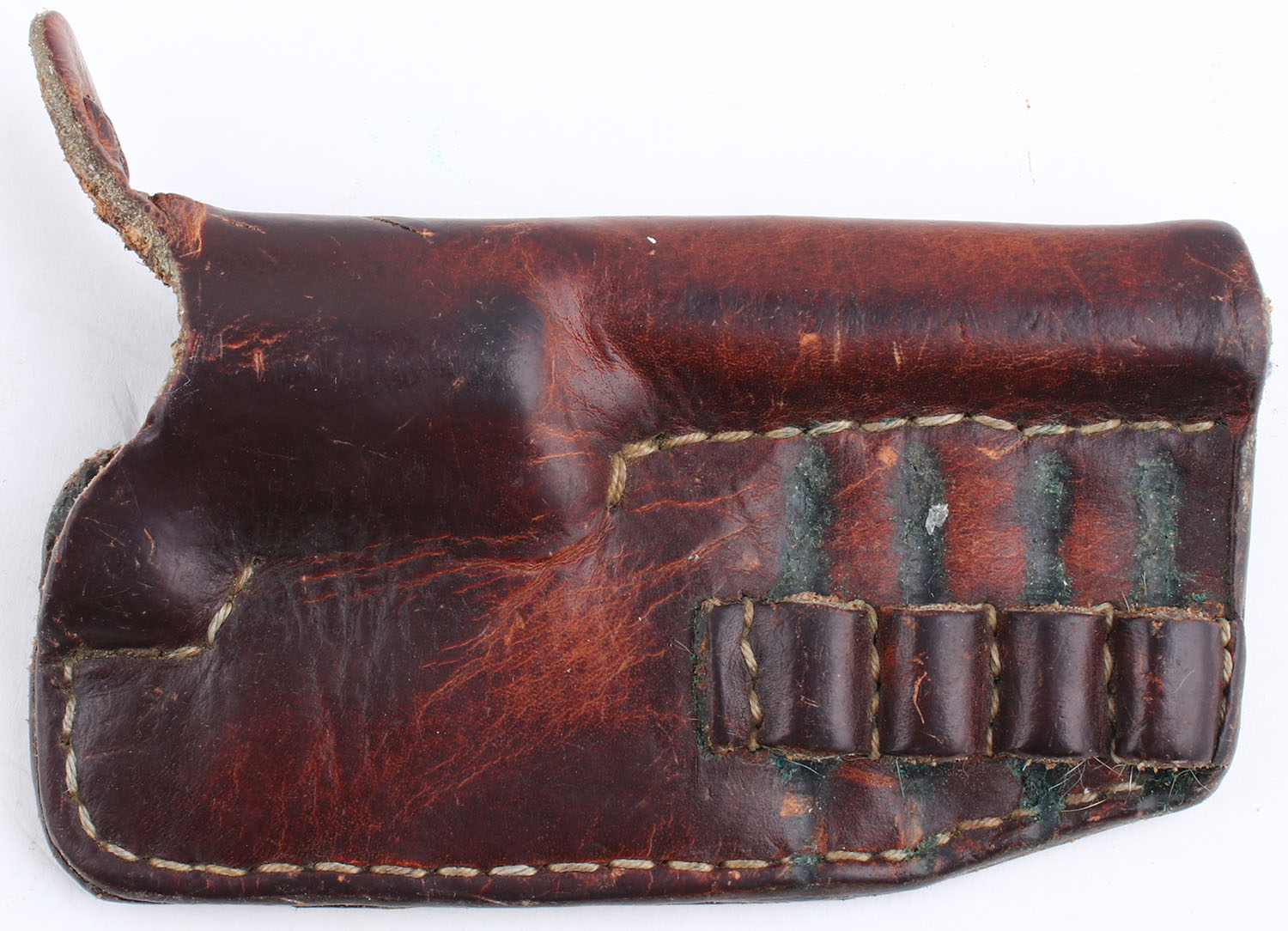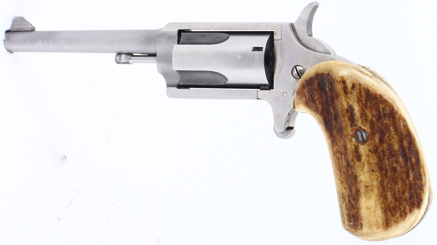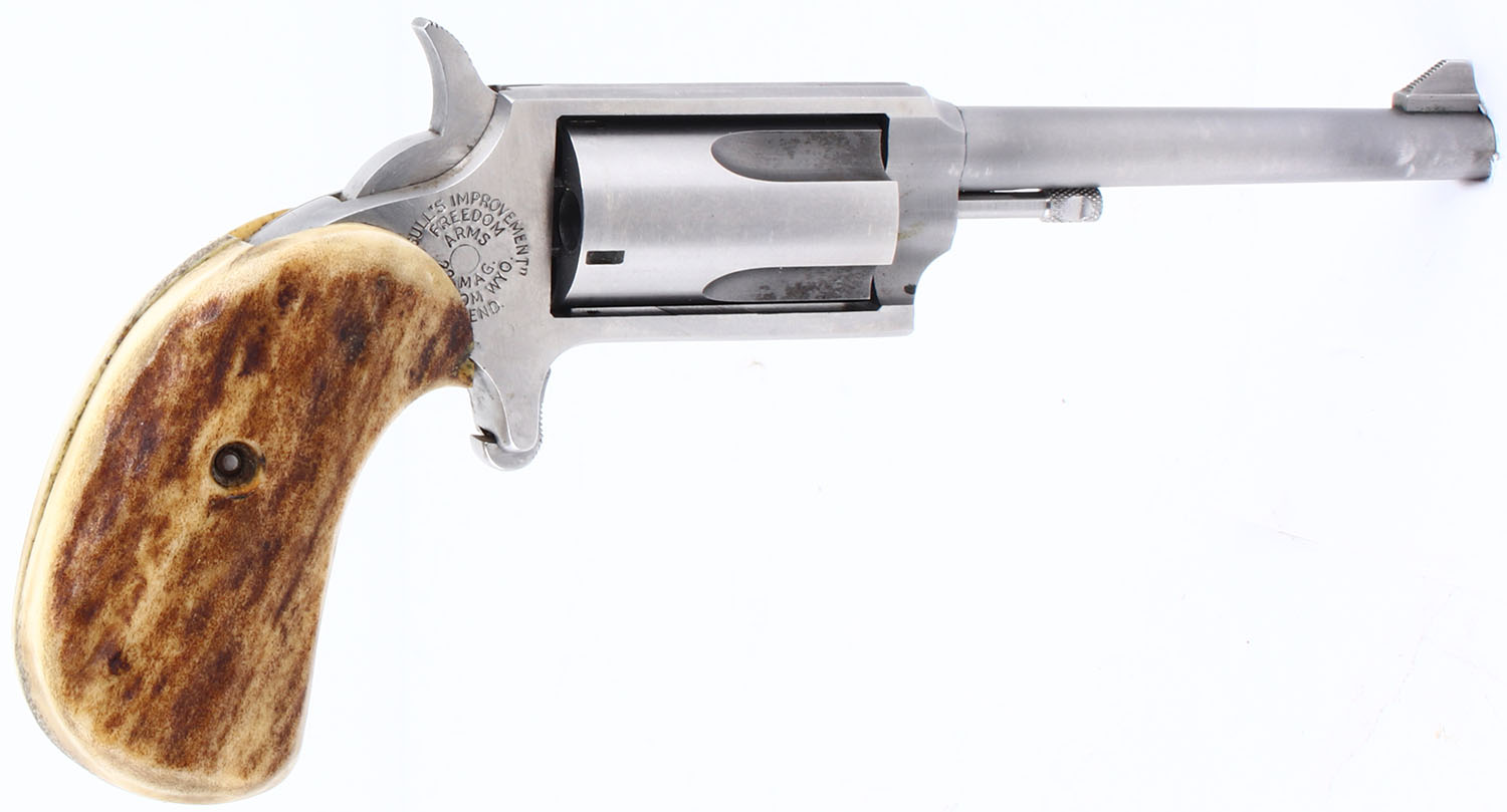 Freedom Arms, Mini Revolver ''Casulls' Improvement'', CAL: 22 MAG. MFG: Modern. SN: B25519, Single Action Revolver, 3'' barrel. The custom stag grips are in very good condition with light handling wear and some age soiling. The stainless finish on the gun is in very good condition with some wear. Bore is excellent. Mechanically solid, the cylinder has some side to side & back & forth play. Rudimentary sights, serrated front ramp sight is affixed to the barrel, rear sight trough is cut into the frame. Comes with a leather holster that appears to be custom made for this gun and has four slots for extra 22 MAG rounds, and a belt loop, and a hammer loop. FFL Req. - Value: 250 to 500