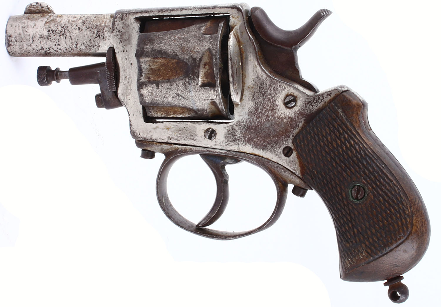 Belgian, Bulldog, CAL: 32 Short, MFG: 1880's-1920's. SN: 377, Double Action Revolver, 1 3/4'' barrel. The checkered wood grips are in very good condition with some handling wear and age soiling. The nickeled finish on the gun is in poor condition with substantial wear and rust speckling. The gun is a mix of rust speckling and nickel with high wear areas like the hammer, trigger, trigger guard, and front and back straps of the frame being covered in dark brown patina. Bore is fair, the rifling is visible and defined but thin and substantially darkened with even roughness and some pitting. Mechanically fair, the cylinder has substantial side to side & back & forth play. The hammer will not lock to the rear for firing in single action but the double action seems to function. Front blade sight is affixed to the barrel, no rear sight. FFL or C&R Req. - Value: 100 to 300