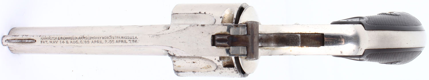 Harrington & Richardson, Auto Ejector Second Model Fifth Variation, CAL: 38 S&W, MFG: 1897-1908. SN: T56095, Double Action Revolver, 3 1/8'' barrel. The checkered rubber grips are in good condition with light handling wear, some age soiling, and a crack on the bottom of the left grip panel. The nickeled finish on the gun is in good condition with some wear and rust speckling. Bore is very good, the rifling is strong but slightly darkened with light even roughness and very light pitting. Mechanically solid, the cylinder has substantial side to side & back & forth play. Rudimentary sights, front blade sight is affixed to the barrel, rear sight is integral to the barrel latch. FFL or C&R Req. - Value: 100 to 200