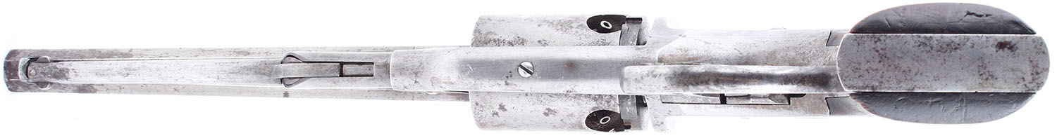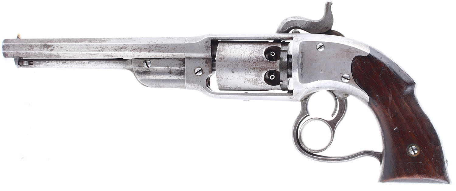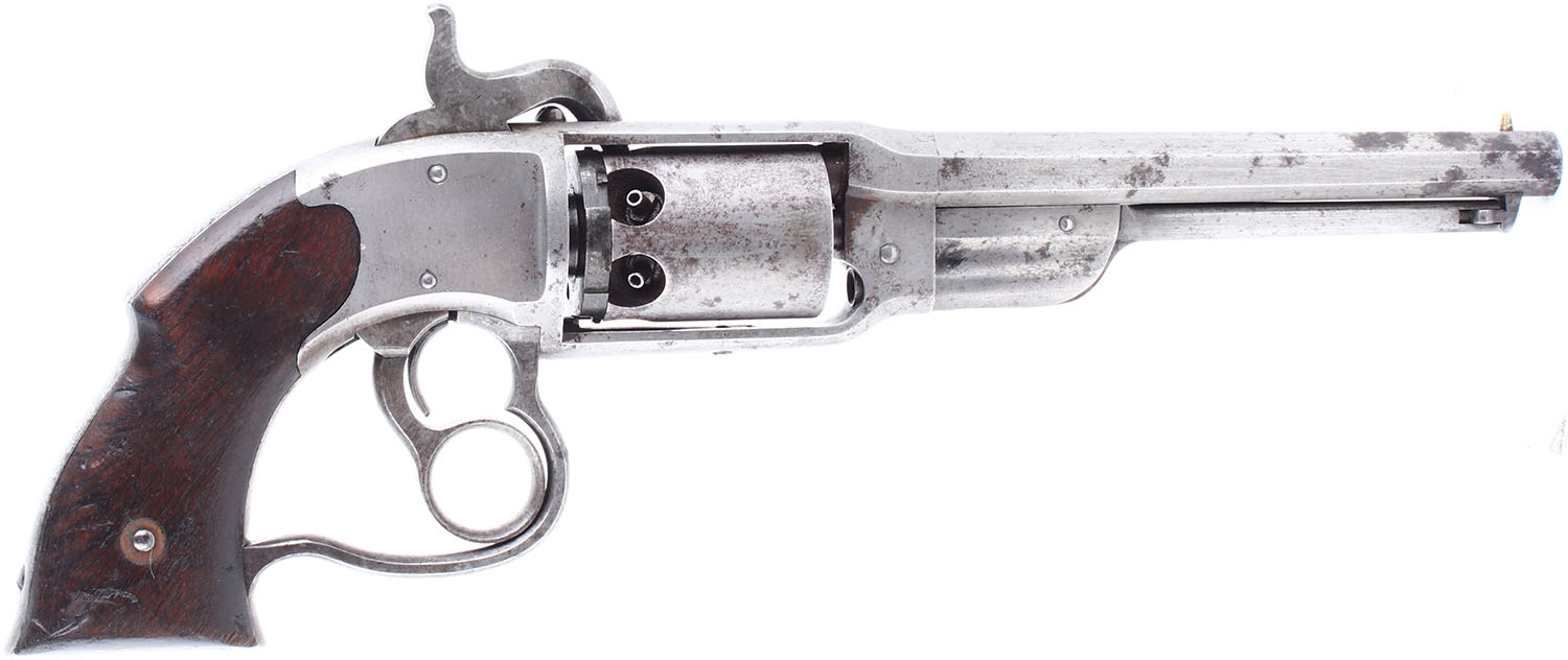HISTORY: This revolver was an interesting stepping stone in the history of military side arms & weapons technology. They are an early predecessor to double action revolvers, the lever underneath the trigger cocks the hammer & rotates the cylinder. This gun was only made in 1861 & 1862.