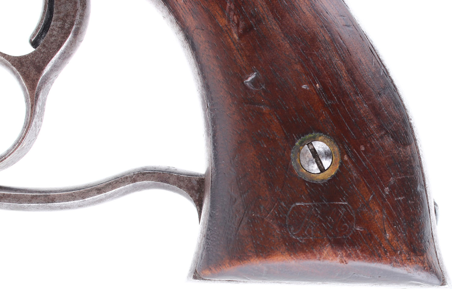 This gun was one of the US military contract pistols. The stamp ''MM'' on the grip denotes that it was inspected by M. Moulton, a US inspector known to have inspected various small arms from 1861 to 1864. There are also various proof markings including a ''W'' stamped on the barrel, ram rod housing, & frame. The cylinder is marked with the letter H between two of the percussion nipples, there are also some vice marks on the cylinder.