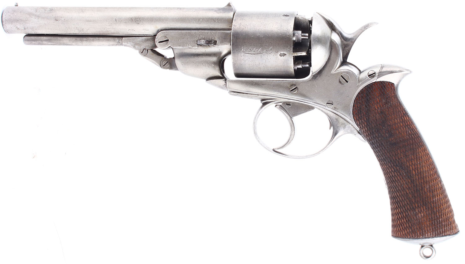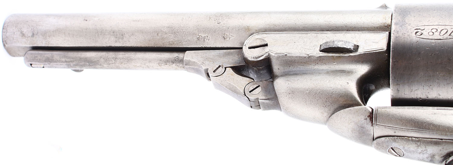 HISTORY: These early double action percussion revolvers were largely hand-made, although some parts were machine-made. No patent was taken out for these revolvers under Daw's name; the mechanism is based on Pryse & Cashmore's Patent. Pryse & Cashmore manufactured all of these weapons, either as complete weapons or partially finished for completion at 57 Threadneedle St. London. The amount of hand fitting that needed to be done on these revolvers substantially drove up the cost which is one of the main reasons this gun failed to get military contracts.
