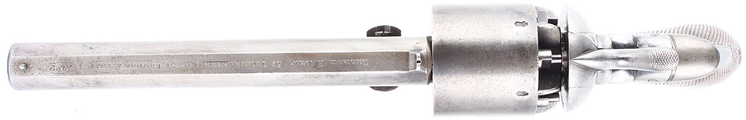 MARKINGS: The top of the barrel is marked ''George H. Daw 57 Threadneedle St. London Patent No 1082''. The gun has various British proof marks on the barrel and cylinder. The side of the cylinder is marked ''No 1082'', the face of the cylinder has the numbers 1-5 marked between each chamber.
