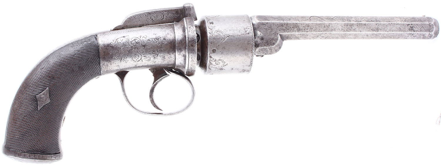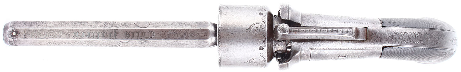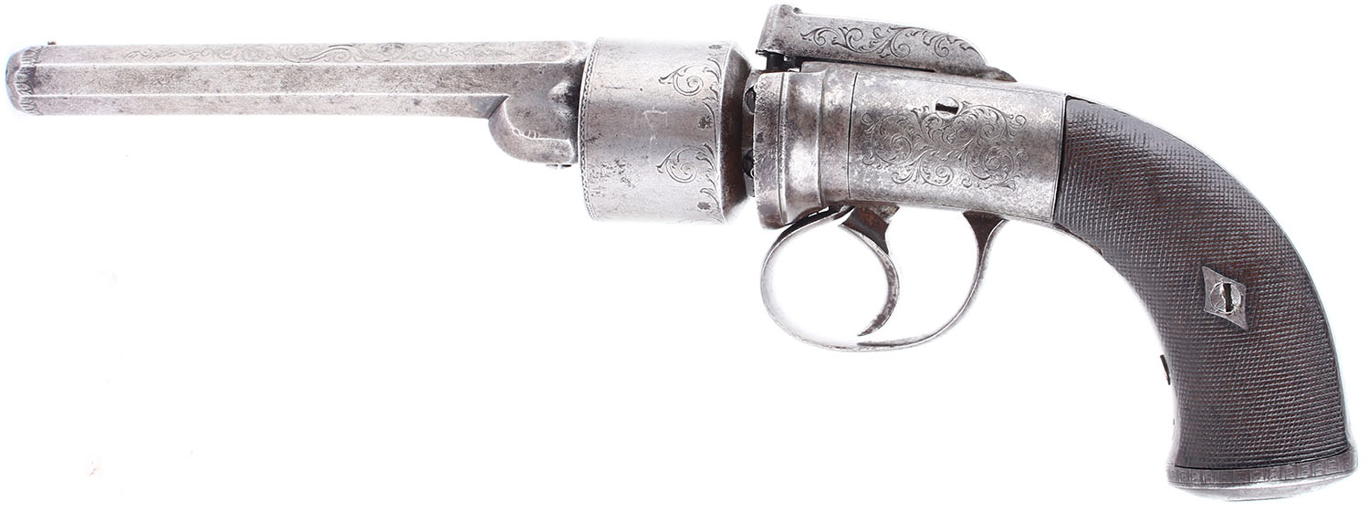 Unknown Maker (British), Transition Revolver (Probably a Converted Pepperbox), CAL: 38 Cap and Ball, MFG: Circa 1820-60. SN: 957, Double/Single Action Percussion Revolver, 5 1/4'' barrel. The checkered wood grips are in fair condition, they have darkened substantially and have a large chip out of the corner of the right grip. The grips look good but have substantial cracks on the inside that jeopardize their structural integrity. The finish has worn and toned to a thin brown patina over gun metal grey. There are scroll engravings all around the gun that are intact and beautiful. Bore is poor, the rifling is defined but thin and dark with substantial roughness and pitting. Mechanically solid, seems to function well, the cylinder does have some play. Front bead sight is threaded into the barrel. Antique, no FFL Req - Value: 600 to 1200