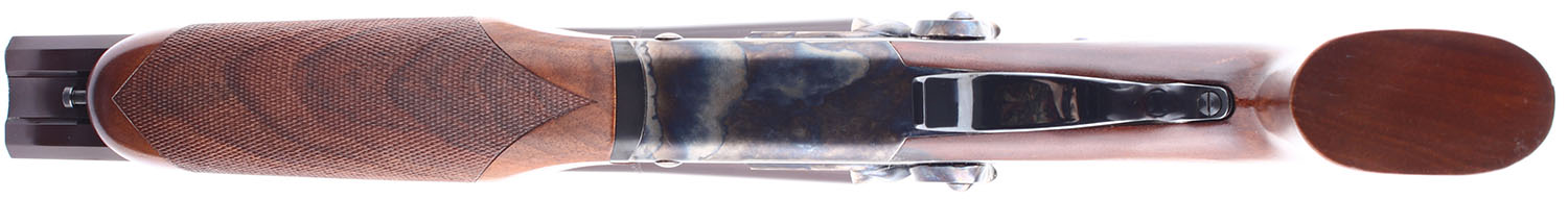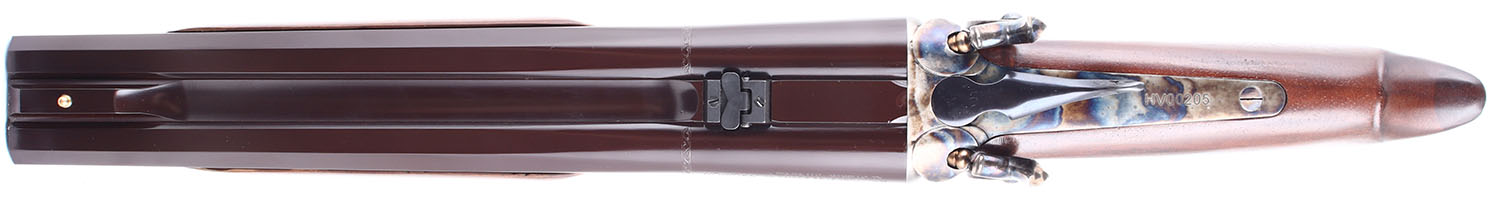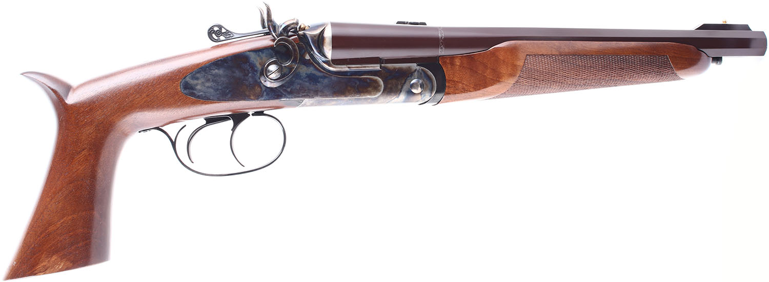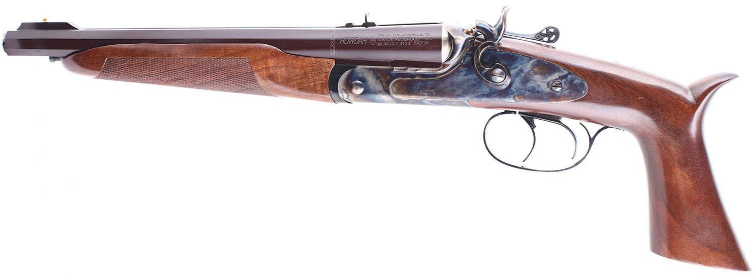 CASED D. Pedersoli, Howdah Vintage, CAL: 45 LC/410 GA, MFG: Modern. SN: HV00205, Side by Side Double Barrel, 10'' barrel. The wood grip and checkered wood forend are in excellent condition with minimal wear, there is one small edge chip on the bottom of the grip. The browned finish on the barrel rates 99%. The bluing on the trigger guard, triggers, and top lever rates 99%. The case hardening on the frame and hammers is excellent. Bores are excellent, like new. Mechanically very solid, seems to function well. Brass front sight bead is mounted to an elevated platform between the barrels, rear sight is set in a dovetail cut between the barrels and held in with two screws. Comes in the serially matched hard plastic case with an owners manual. FFL Req. - Value: 1500 to 2500