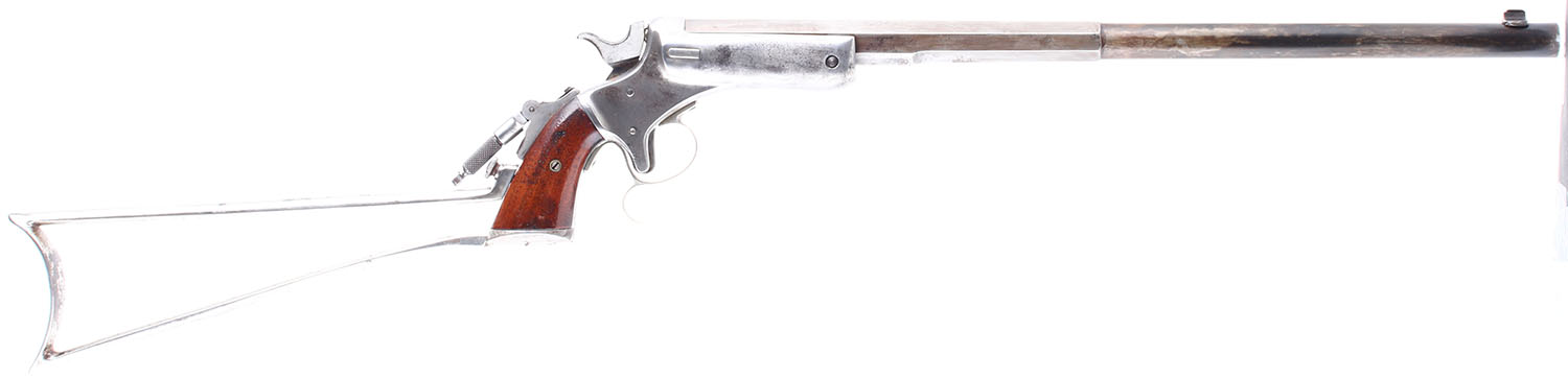 HISTORY: these mid to late 1800's target rifles were meant to be portable, light weight, and accurate. They have stocks that slide into a dovetail cut on the bottom of the grip and are secured by a screw in the back of the grip. These antique ''Pocket Rifles'' are specifically exempt from the NFA and do not require an SBR tax stamp even though they have a short barrel and a stock.