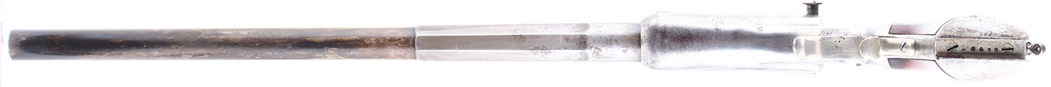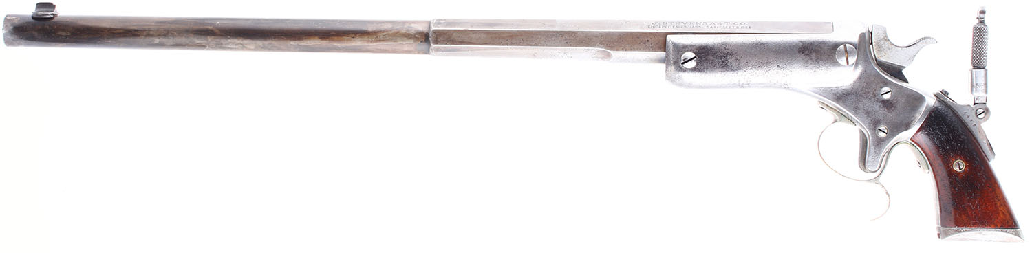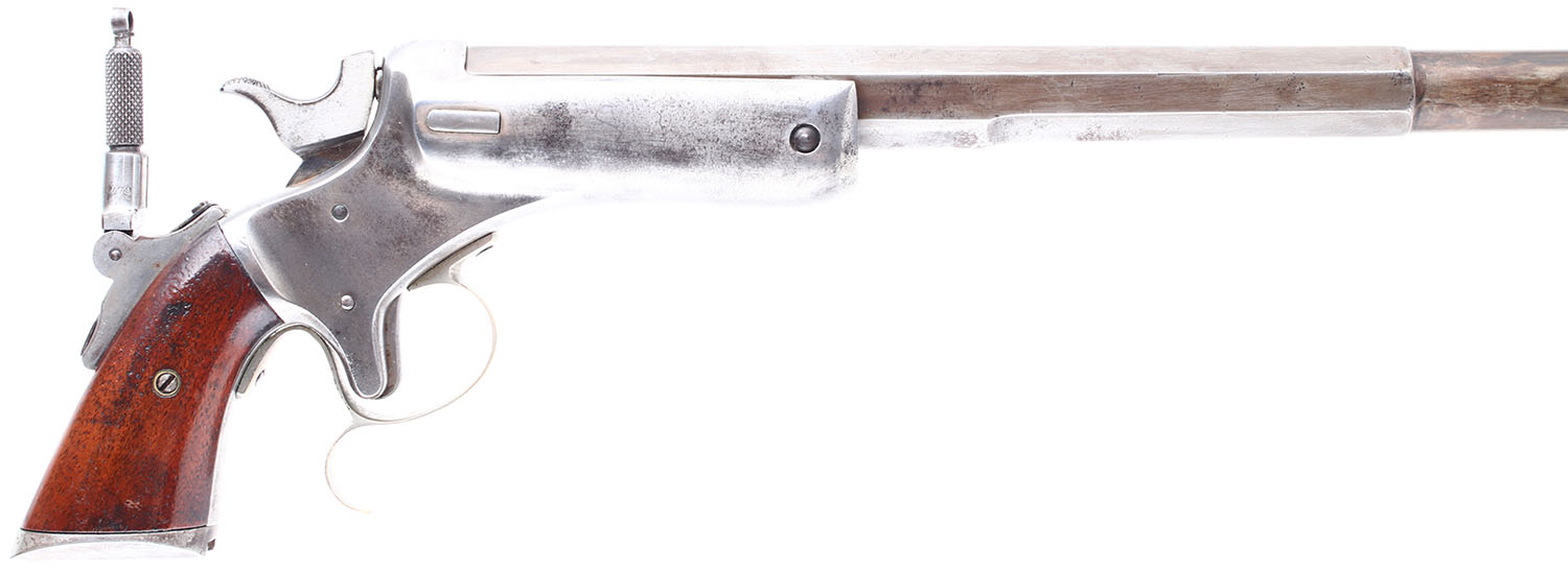 CONDITION: The wood grips are in excellent condition, solid with minimal wear. The nickeled stock is good, solid with some pitting and rust. The bluing on the front of the barrel has toned to a mix of blue and brown patina, the bluing on the octagonal rear portion of the barrel has worn very thin and toned to a brown patina. The frame has worn to gun metal grey with very light clean pitting and some thin dark patina. Bore is good, the rifling is thin but very bright with light even roughness. Mechanically very solid, seems to function well. Aperture sights, Rear aperture sight is mounted to the back of the grip, front sight post is set in a dovetail cut on the barrel. Antique, no FFL Req - Value: 1000 to 3000