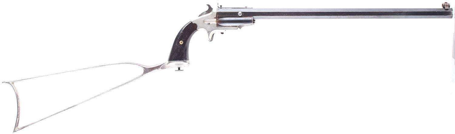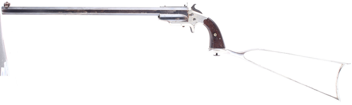 HISTORY: these mid to late 1800's target rifles were meant to be portable, light weight, and accurate. They have stocks that slide into a dovetail cut on the bottom of the grip and are secured by a set screw. These antique ''Pocket Rifles'' are specifically exempt from the NFA and do not require an SBR tax stamp even though they have a short barrel and a stock.