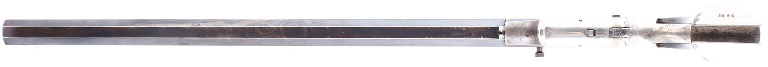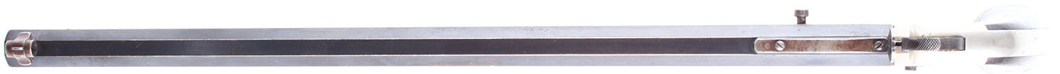 CONDITION: The wood grips are in very good condition, solid with some handling wear, scratches, and dings. The nickeled stock is very good with some clean pitting. The bluing on the barrel rates 79%, mostly original blue with some patina, handling wear, and the edges of the octagonal barrel being worn to gun metal grey. The nickeled finish on the frame is very good with some patina scratches and dings. Bore is fair, the rifling very pronounced but thin and dark with even roughness but no pitting. Mechanically very solid, seems to function well. Odd target sights, Rear aperture sight with a notch cut into the top of it is screwed to the top of the barrel, front shrouded sight with secondary sight post is set in a dovetail cut on the barrel. Antique, no FFL Req. - Value: 1000 to 3000