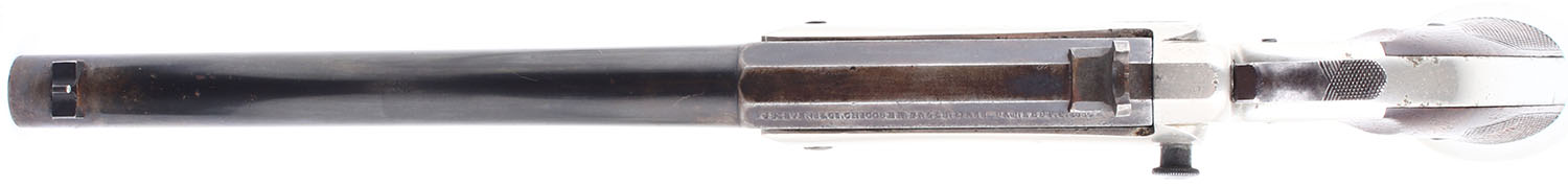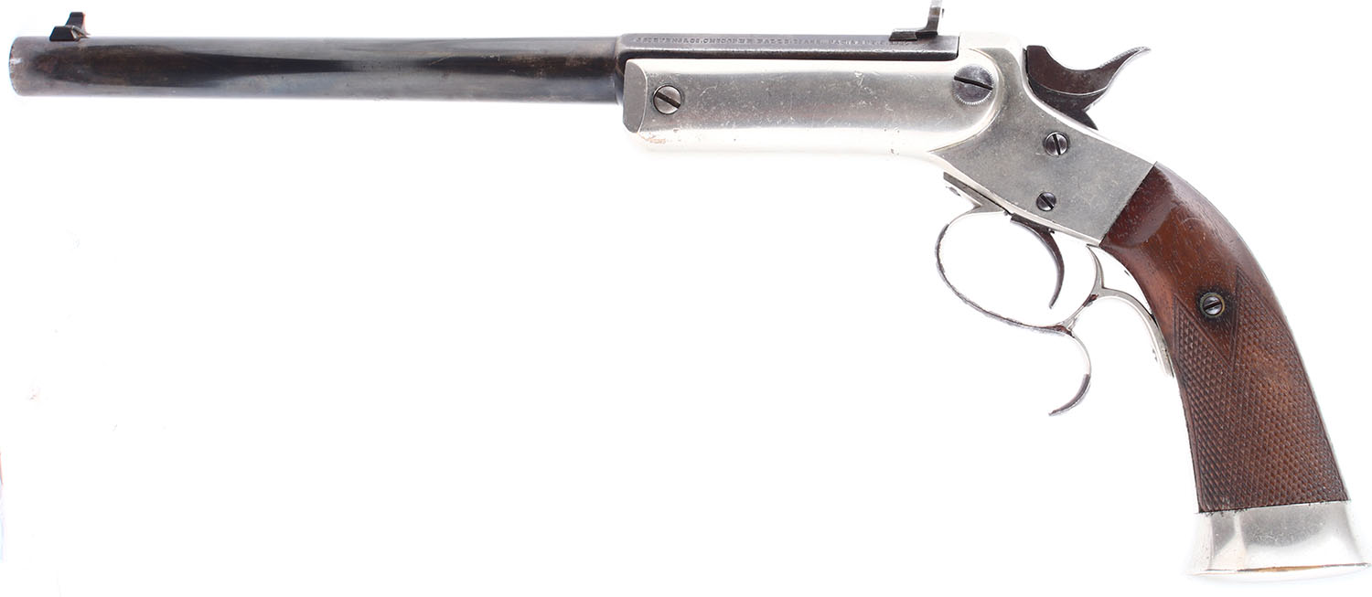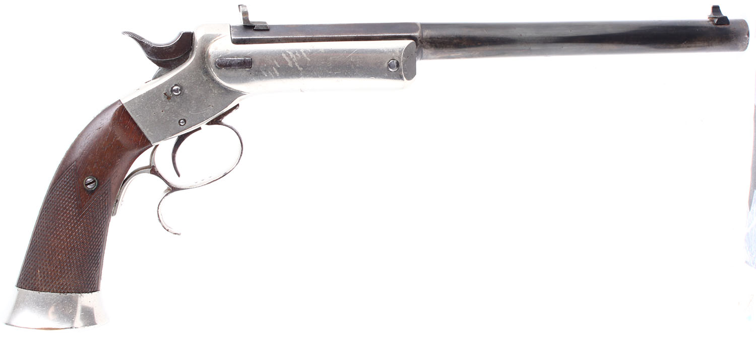 J. Stevens & Co., Model 36 LORD Pistol CAL: .22 (Probably Short), MFG: 1884-98. SN: 444, Single Shot, 10'' barrel. The wood grips are in excellent condition with some handling wear. The bluing on the barrel rates 82% with some patina and gun metal grey. Bore is very good, the rifling is thin but very bright with very light roughness. Mechanically solid, seems to function well. Buckhorn sights, rear buckhorn sight and front post sight are set in dovetail cuts on the barrel. Antique, no FFL Req. - Value: 800 to 1600