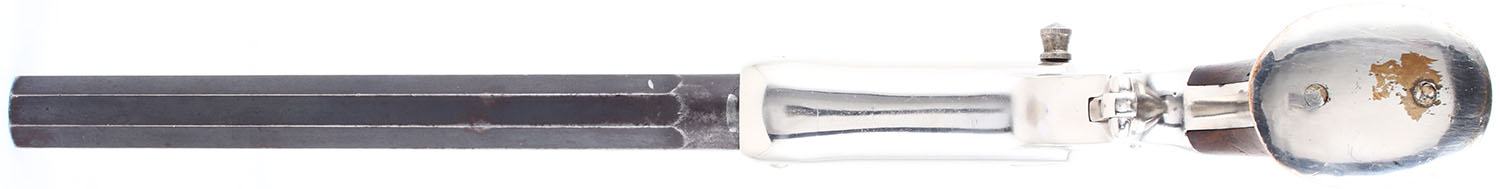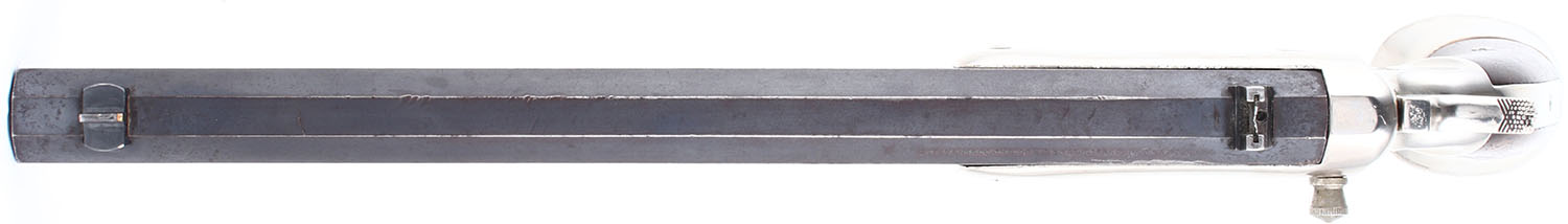 CONDITION: The wood grips are in very good, near excellent condition, solid with minimal wear. The reblued barrel Rates 96% with the corners of the octagonal barrel being worn to gun metal grey. There is some clean pitting that was blued over, as well as some rust speckling and patina. The nickeled frame is very good, near excellent. The front and backstraps of the frame have small areas that have worn to gun metal grey with some rust speckling. Bore is good, the rifling is strong but very dark with even roughness. Mechanically solid, seems to function well for the most part but the barrel release button has been replaced and no longer releases the barrel. The spring and catch are still present and seem to be original but the makeshift button is too wide to work properly and will likely need to be replaced. Target sights, rear notch sight and front sight post are set in dovetail cuts on the barrel. Antique, no FFL Req - Value: 500 to 1000