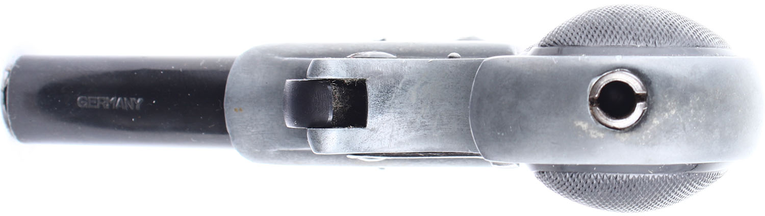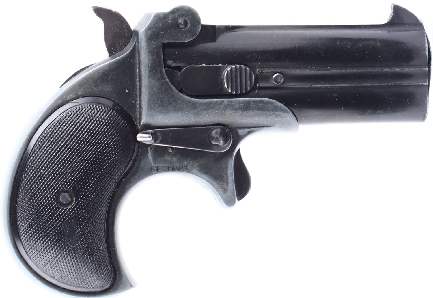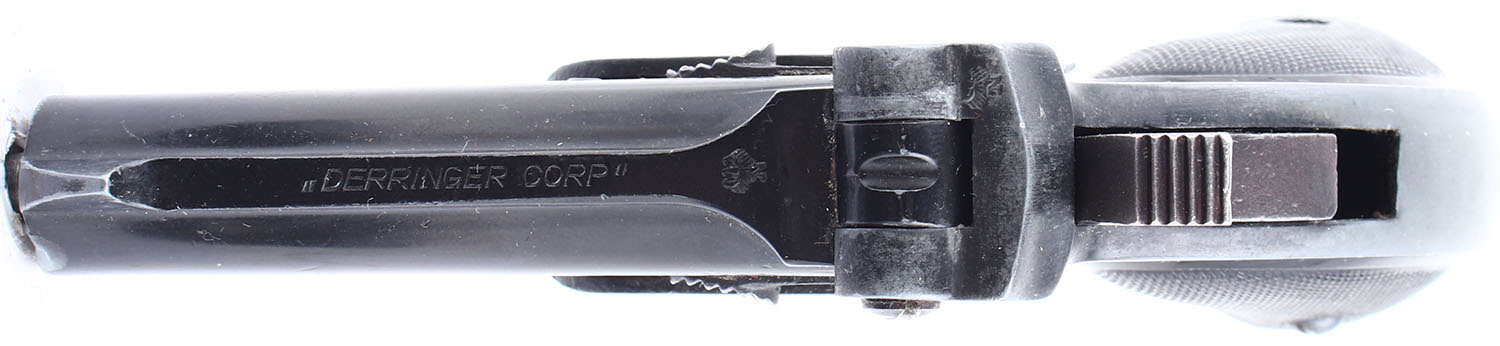 Derringer Corp., Over Under, CAL: 22LR, MFG: Modern. SN: 8658, Over Under Derringer, 2 7/8'' barrel. The checkered plastic grips are in very good condition with minor handling wear and dings. The black finish on the barres rates 98% with some minor handling wear and a ding on the left side of the top barrel. The black finish on the frame has worn down to a mix of black and gun metal grey. Bores are excellent, very bright, strong, rifling. Mechanically solid, the hammer and trigger mechanism seems to work well and the barrel lock up is solid. Rudimentary sights, rear sights notch is cut into the barrel, front blade sight is integral to the barrel. FFL or C&R Req. - Value: 100 to 200