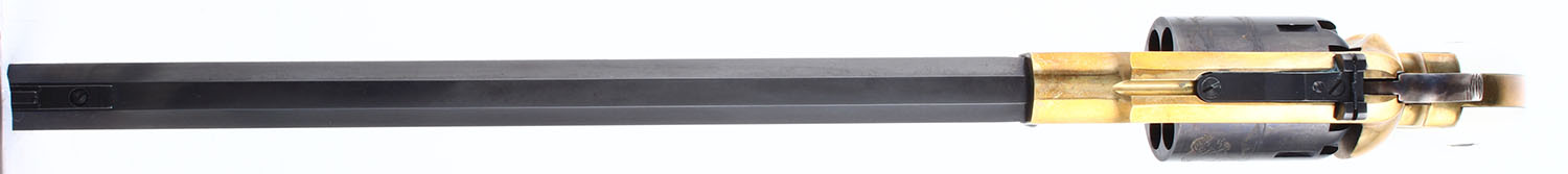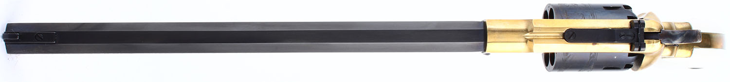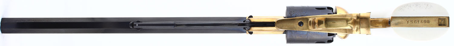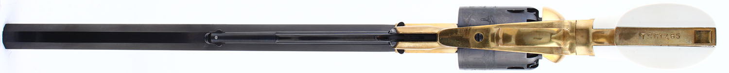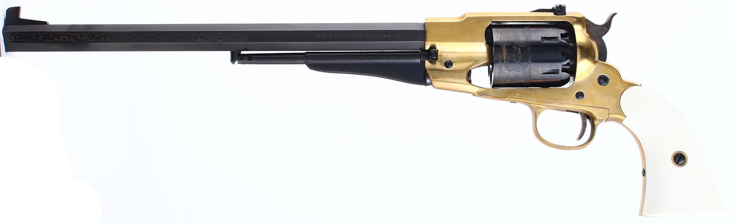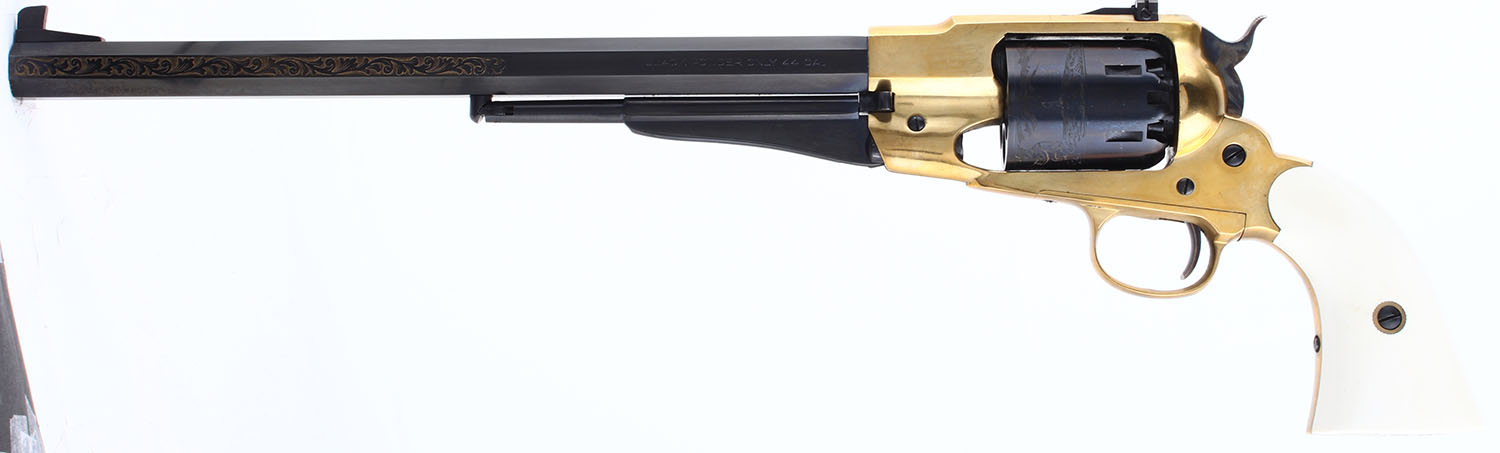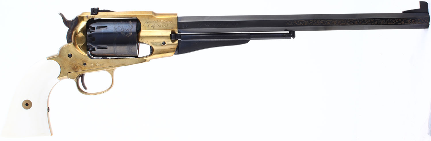 CASED SET, F.LLI Pietta, 1858 Buffalo Revolvers Limited Edition 1 of 5000, CAL: 44, MFG: Modern, SN: TSG1466/TSG1465, Percussion Muzzleloader Pistols, 12'' barrels. Both revolvers are perfectly matching. The grades that follow are for both revolvers. The faux ivory grips are excellent. The metal blue finish on the barrel & cylinder rates 99%. The barrel has 6'' of floral scroll engraving on both sides & the cylinders have a buffalo & gunman scene. The polished brass frames are excellent. The case-hardened hammers are excellent. Bores are excellent. Adjustable rear sight & tall blade front sight. Marked ''LIMITED EDITION 1 OF 5000''. Mechanically excellent. Both revolvers come in a factory wood presentation case, with red interior & glass top. A nice blackpowder set. Blackpowder, No FFL Req. - Value: 600 to 1000