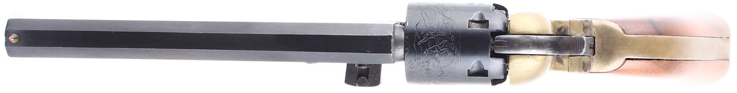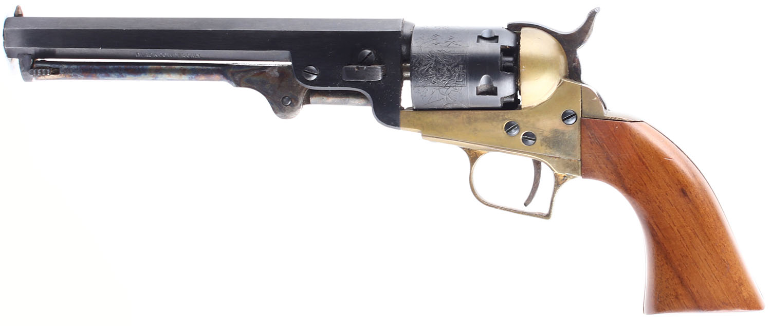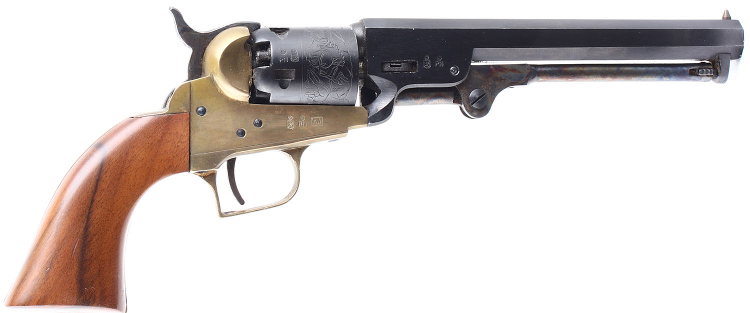 R.ETE, Copy of 1849 Pocket, CAL: .31, MFG: Modern, SN: A850, Percussion Muzzleloader, 6'' octagon barrel. The manufacturer's mark is on the butt, SN is on the bottom of the frame & there are proof marks on right side of the barrel & frame. The wood grips are excellent. There are minor handling marks to the finish. The metal blue finish on the barrel & cylinder rates 90% & the brass frame is excellent, with an aged patina. Case-hardened ram-rod & hammer. Stagecoach cylinder scene is visible. Bore is excellent. Brass cone front sight. Mechanical operation appears to function properly. Timing is correct & action is tight. Blackpowder, No FFL Req. - Value: 200 to 400