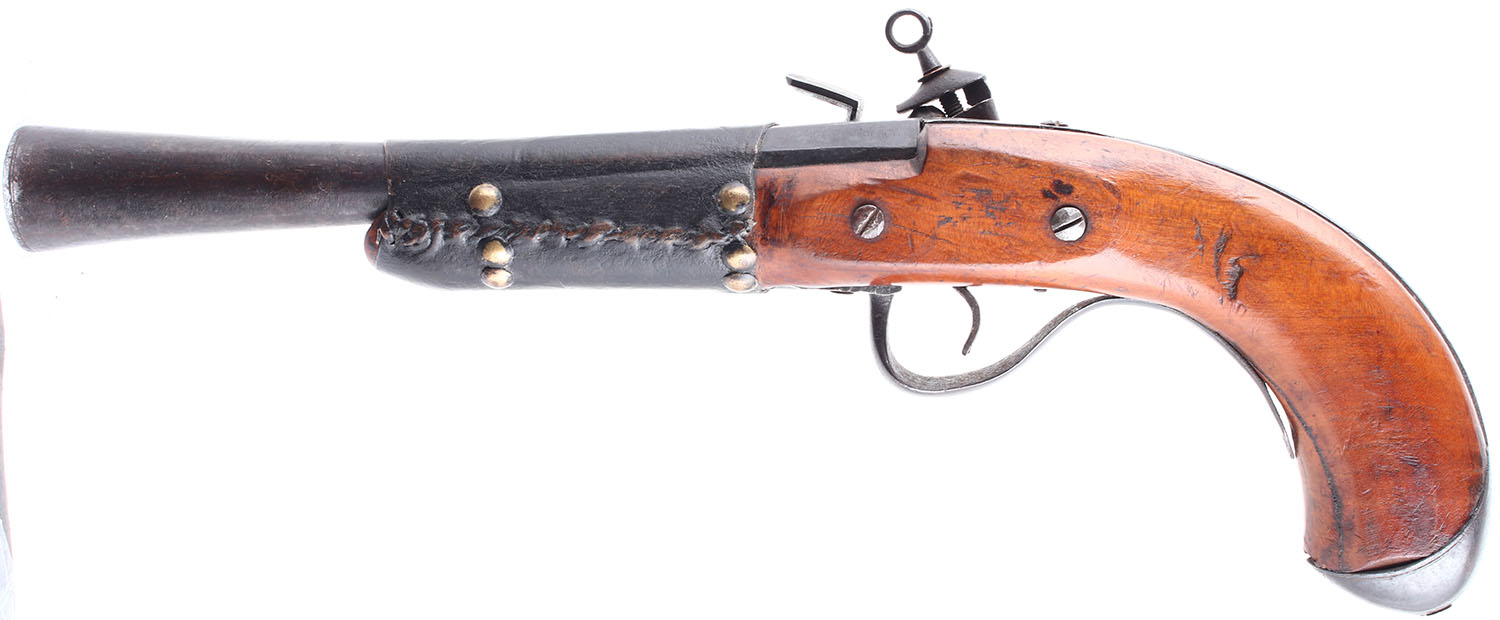 Mexican Colonial Trabuco Blunderbuss Pistol, CAL: appx 20GA, MFG: circa 1800's, SN: NONE, Flintlock Muzzleloader, 10'' barrel. HISTORY: In colonial Mexico, a Trabuco or blunderbuss pistol was a type of muzzle-loading firearm that served as an early form of a shotgun for close-quarters combat. The Trabuco blunderbuss pistol was considered effective for its intended purpose & gained a prominent place in colonial weaponry and historical narratives.