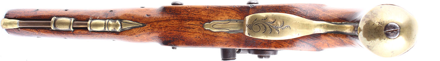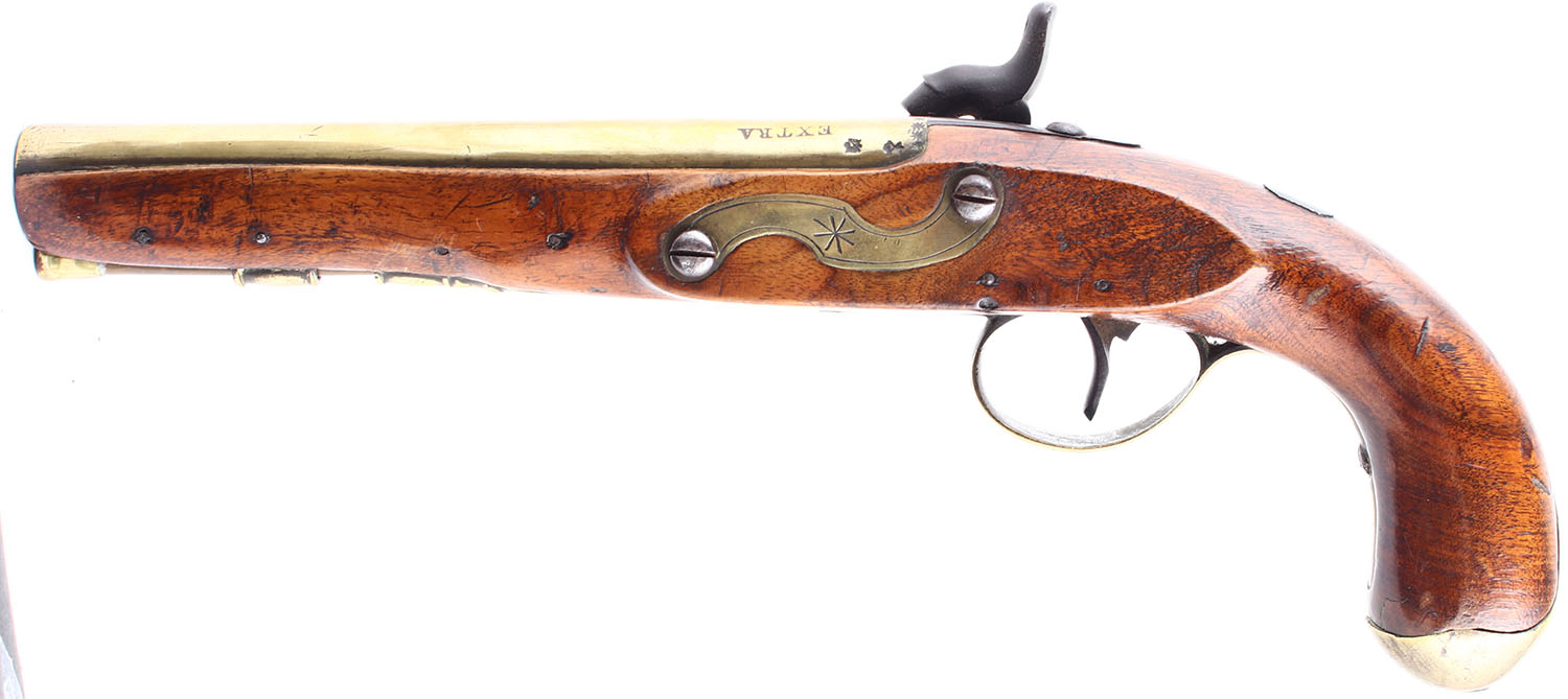 CONDITION: The original wood stock is good & solid. This pistol has most certainly been lightly sanded & refinished over the course of it's lifespan. There are multiple smoothed contusions & dings. The barrel, trigger guard, butt cap, ramrod & ramrod guides are all brass. The brass has been cleaned. It has normal wear marks. This action was originally flintlock and was later converted to percussion. The side plate, hammer & upper tang have all fully toned a dark brown patina. Bore is fair, dark & rough. No sights. Ramrod present. Antique, No FFL Req. - Value: 700 to 1300