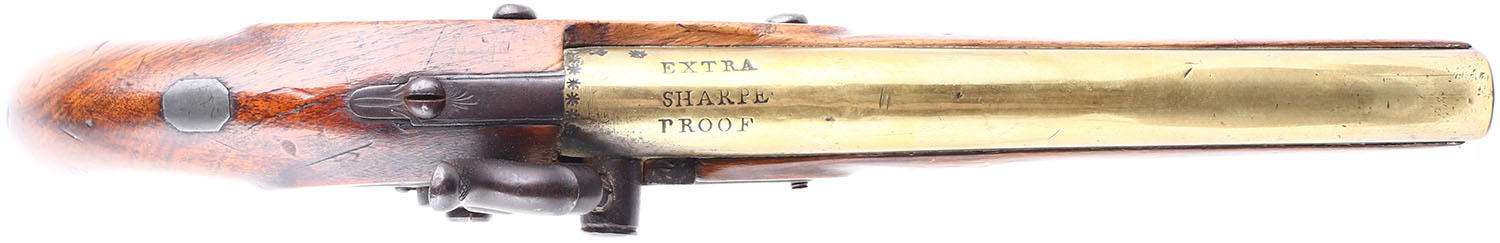 HISTORY: John Sharpe was a prolific maker of export-quality guns & pistols from 1811 to 1831. Cheap flintlock belt pistols, often with brass barrels marked ''EXTRA PROOF'' by Sharpe are fairly common. They were normally used as ship weapons & for personal defense. Sharpe was not one of the original sixteen contractors for the war, but he clearly was either a subcontractor or a Board of Ordnance maker just after the War of 1812. Sharpe apparently had contracts with the North West Company & other trading firms around 1818, to supply N.W.C with guns.