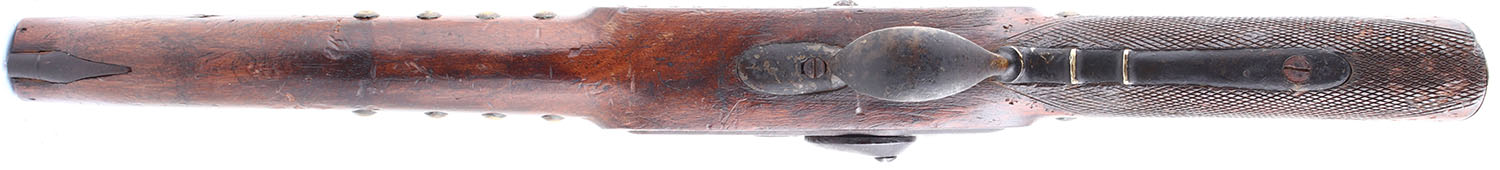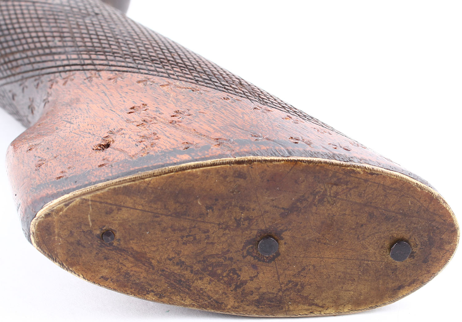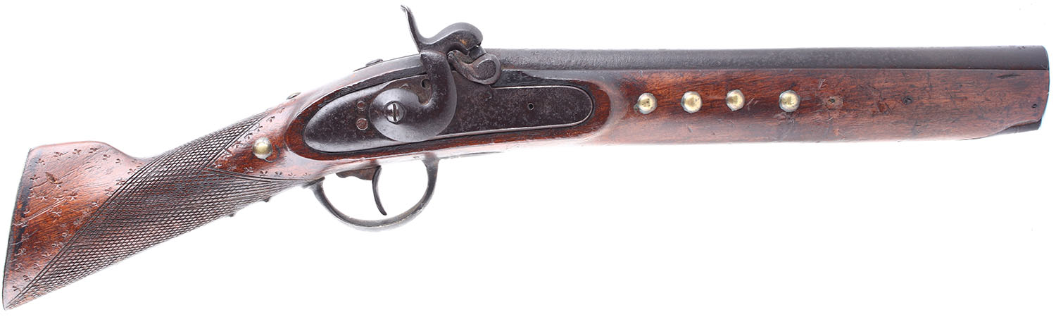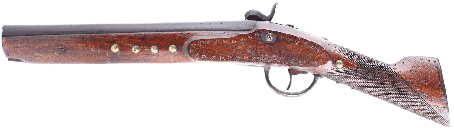 Indian ''Blanket Gun'', CAL: .69, MFG: early to mid 1800's, SN: NONE, Percussion Muzzleloader, 12 1/2'' barrel. According to the consignor, this example was originally cut down from a .69cal military flintlock musket, converted to percussion, then modified to it's current configuration. The checkered straight grip stock is very good & solid. There are numerous contusions, nicks & dings, with a good amount of asterisk embellishments in the stock. There are no visible markings on the gun. The metal components have fully toned to a brown patina, with consistent roughness throughout. Asterisk embellishments on the top of the barrel, same as the stock. Bore is poor, dark & rough. No sights. Brass tacks & buttplate. These nice early altered Indian Blanket Guns are becoming more scarce & truly embody the Indian Wars Era. 22'' OAL. Antique, No FFL Req. - Value: 1000 to 2000
