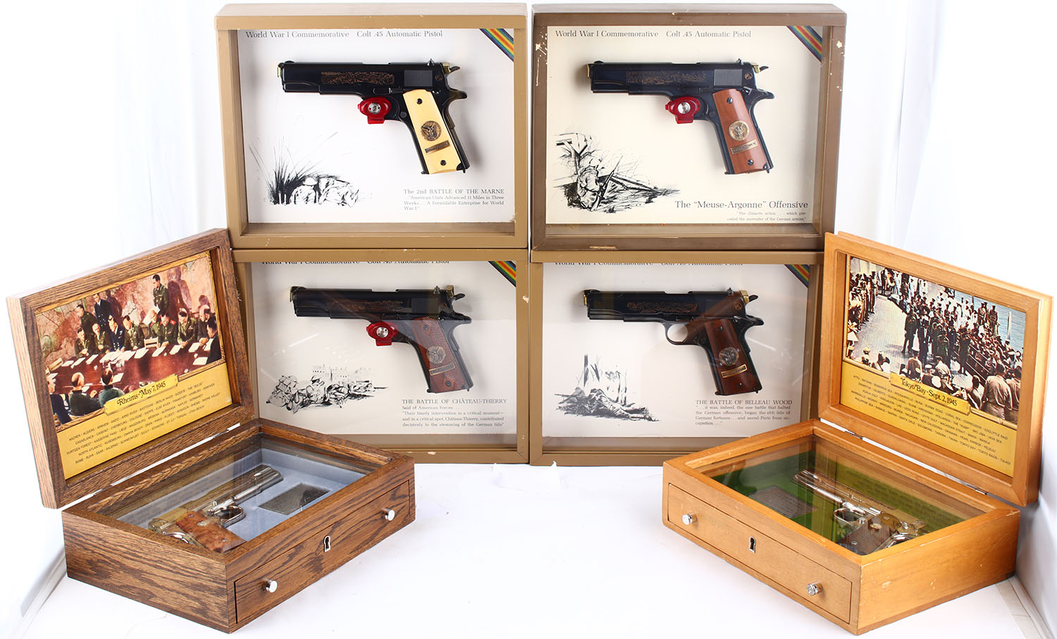 RARE CASED Full set of six serially matching World War commemorative Colt Government Model 1911 and 1911A1 pistols. These guns have high luster blued and nickeled finishes, they commemorate major battles in which the US participated during World War I and the two theaters of operation in WWII. This is an extremely rare set. Many sets of serial matching WWI pistols exist as do matching sets of WWII pistols. WWII sets serial matched to a WWI set were only offered to those who originally purchased the WWI sets and were only made for those who accepted the offer. To find a set with all six pistols, serial matching, is incredibly rare. According to Rock Island Auctions only 7,400 WWI sets were made with only 75 matching WWI & WWII sets being produced.