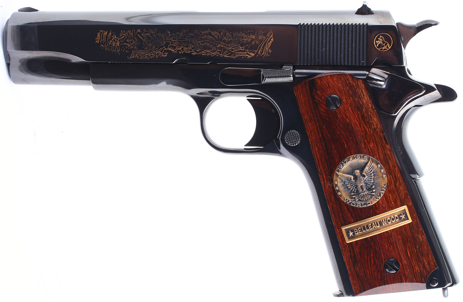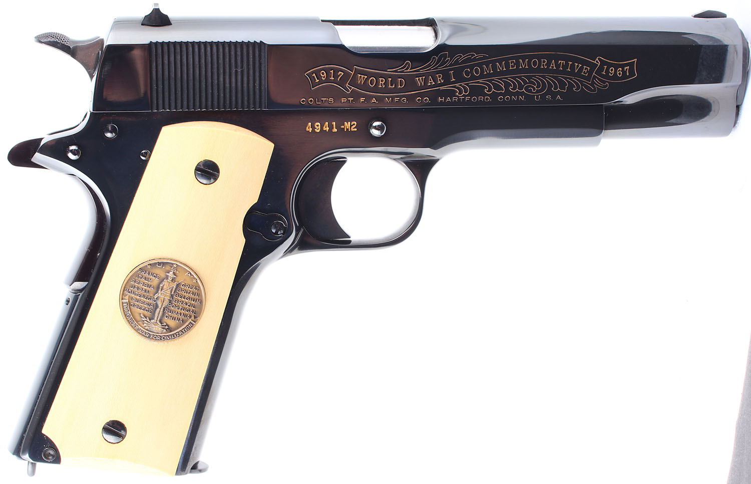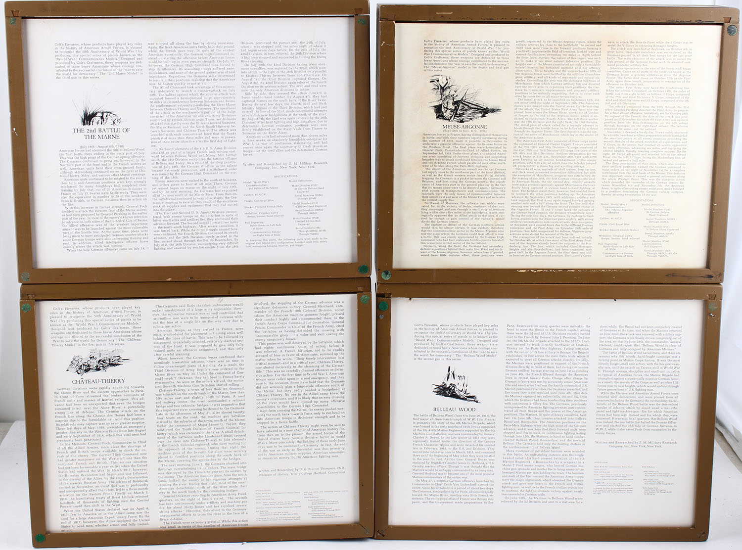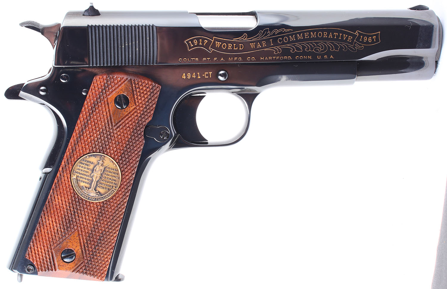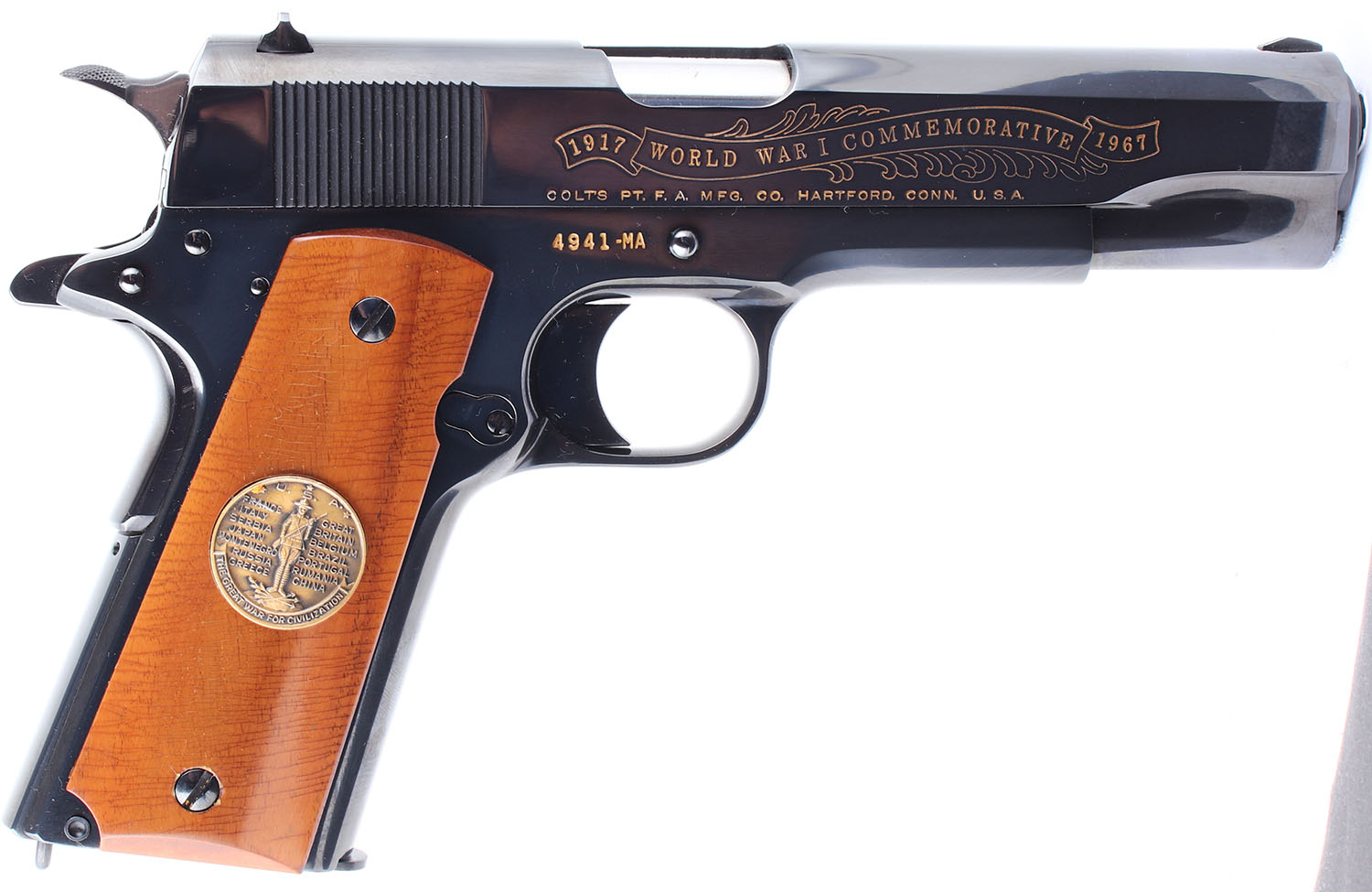 ''Colt .45 Auto'' is engraved on the tops of the barrels. All the engravings on the slides and frames are filled with a gold toned finish. The right sides of the frames are engraved with the serial numbers. The right sides of the slides are engraved with banners reading ''1917 World War I Commemorative 1967'', underneath the banners there is text that reads ''Colt's PT. F. A. MFG. Co. Hartford Conn. U.S.A.''. Each WWI 1911 is engraved with a battle scene on the left side of the slide that matches its case. There is also a Rampant Colt behind the slide serrations on each gun. These pistols are all in excellent or near excellent condition.