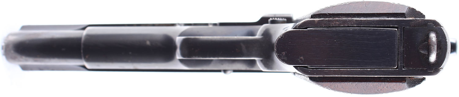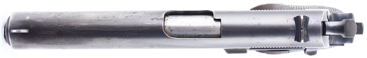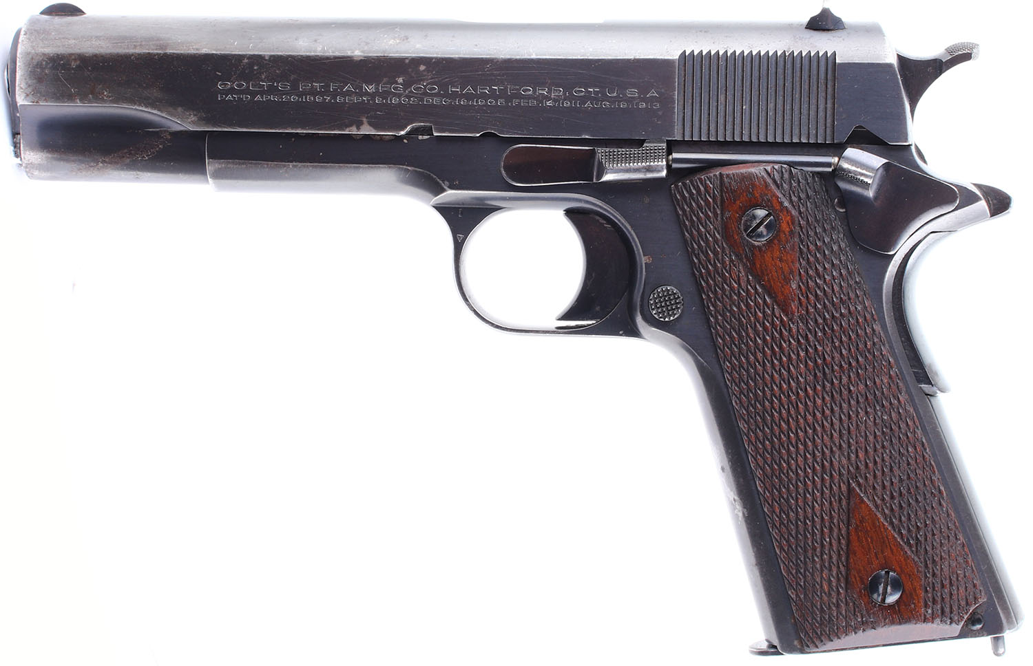 Colt, M1911 Government (commercial), CAL: .45 ACP, MFG: 1922, SN: C13270, Semi Auto Pistol, single action only. 5'' barrel. Checkered wood grips are in very good condition with minor handling wear. The bluing on the slide rates 75%, the bluing on the frame rates 85%, the gun has some surface rust and handling wear on the finish. Bore is good, rifling has slightly darkened but has no visible pitting or rust. Mechanically solid with very little side to side play in the slide, the hammer appears to have been slightly bobbed at some point. steel sights, front sight screwed into the slide, rear sight is set in a dovetail cut on the slide. Comes with one magazine. FFL or C&R Req. - Value: 1000 to 2000