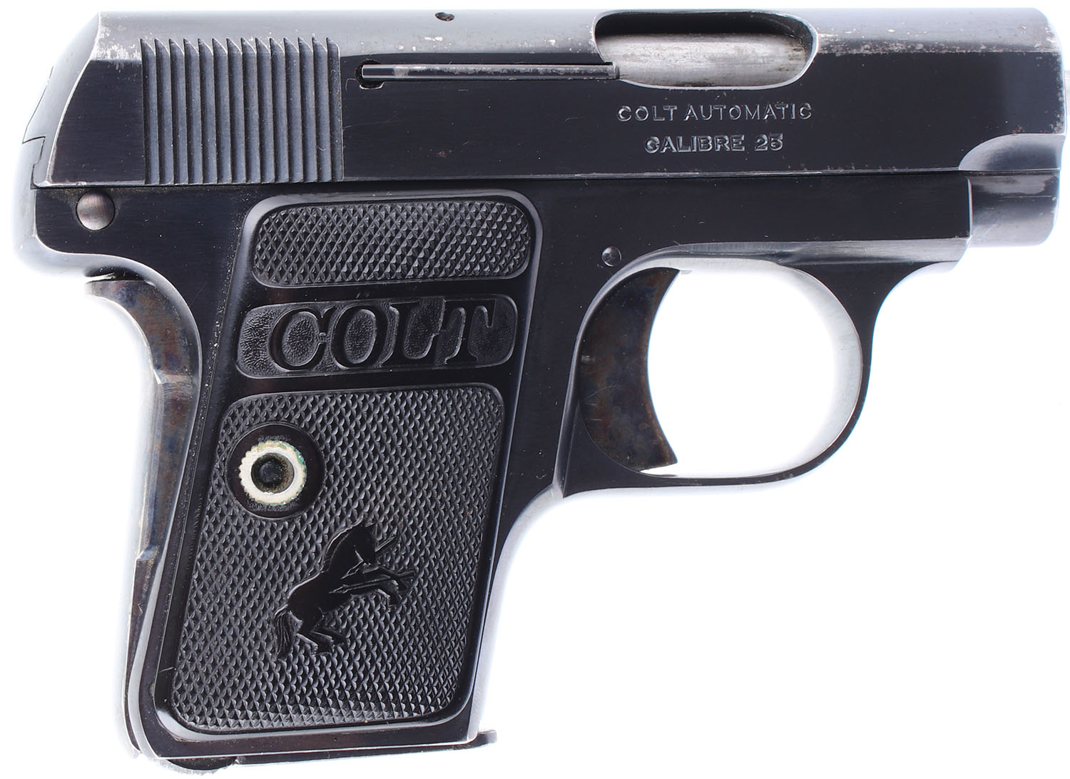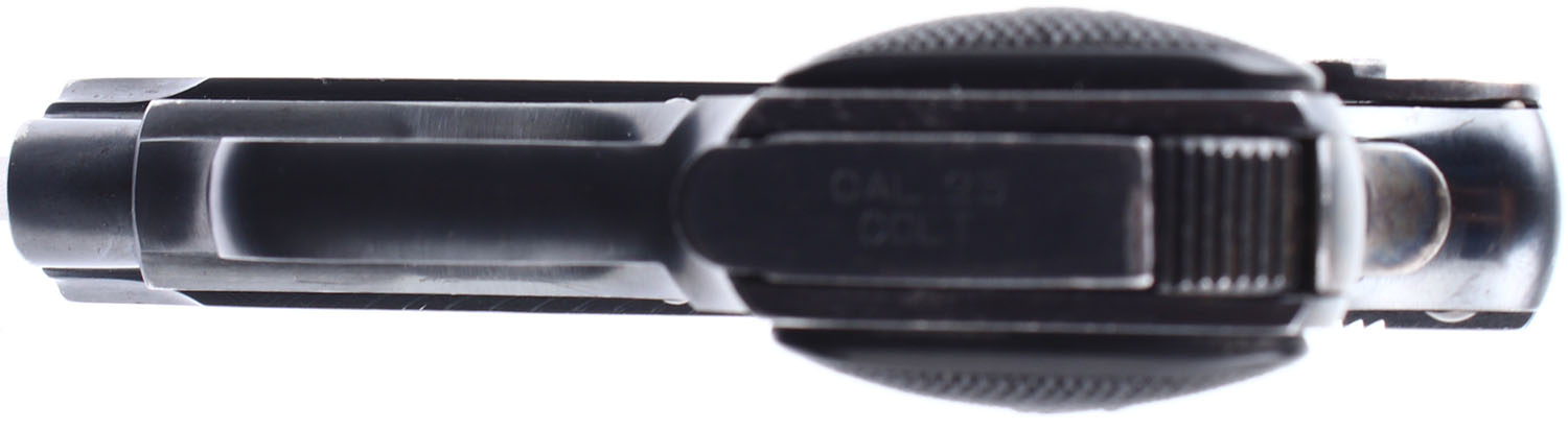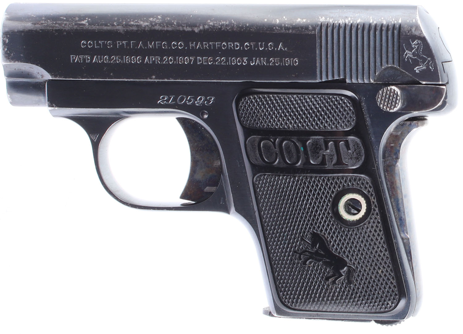 Colt, 1908 Hammerless Vest Pocket, CAL: 25 ACP, MFG: 1919, SN: 210593, Semi Auto Pistol. 2'' barrel. Factory polymer grips are in excellent condition with slight handling wear. The blued finish on the frame rates 97%, the blued finish on the slide rate 90%. Bore is very good, slightly darkened with no substantial pitting. Mechanically solid with little to no side to side play in the slide. Rudimentary sights are cut into the trough on the top of the slide. Comes with one magazine. FFL Req. - Value: 300 to 600