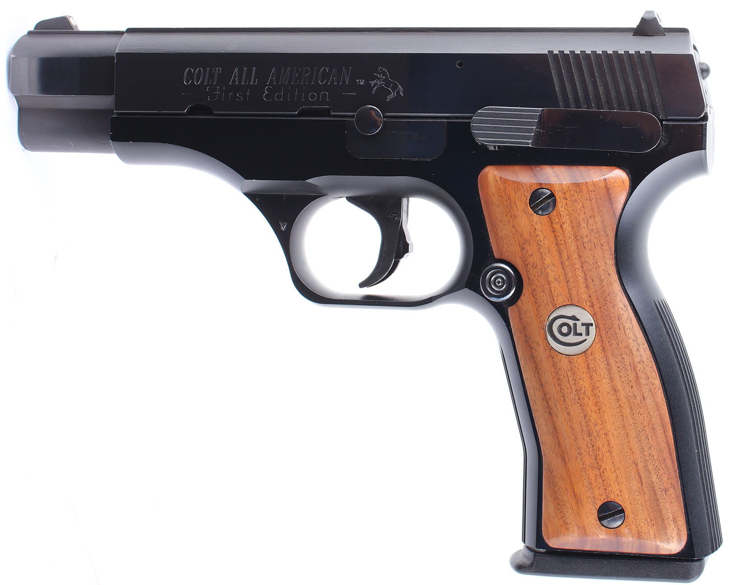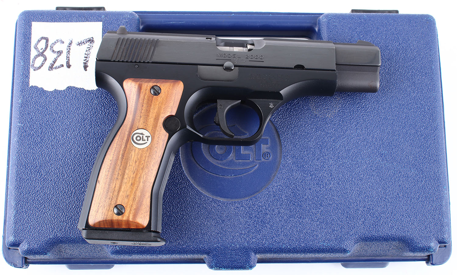 CASED Colt, 2000 All American First Edition, CAL: 9x19mm, MFG: 1991, SN: RK02322, Semi Auto Pistol, double action only. 4 1/2'' barrel. Factory wood grips with colt medallion are in excellent condition. The blued finish on the frame and slide rates 99%. Bore is excellent. Mechanically solid with little to no side to side play in the slide. 3 dot white combat sights, front sight is integral to the slide, rear sight is set in a dovetail cut in the slide. Comes in the factory case with two magazines, speed loader, cleaning brush, and owners manual. FFL Req. - Value: 600 to 1200